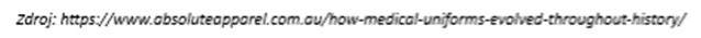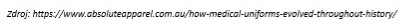 První lékařské a ošetřovatelské uniformy přišly v Krymské válce a to na obou stranách barikády. Dámský oděv sestával z dlouhých šatů, bílé zástěry a čepce. Na začátku 20. století se jako ošetřovatelská uniforma nosila zástěra (šaty) s dlouhými rukávy a zavazováním na zádech, chránit měla civilní oděv. Nezbytný byl čepec.