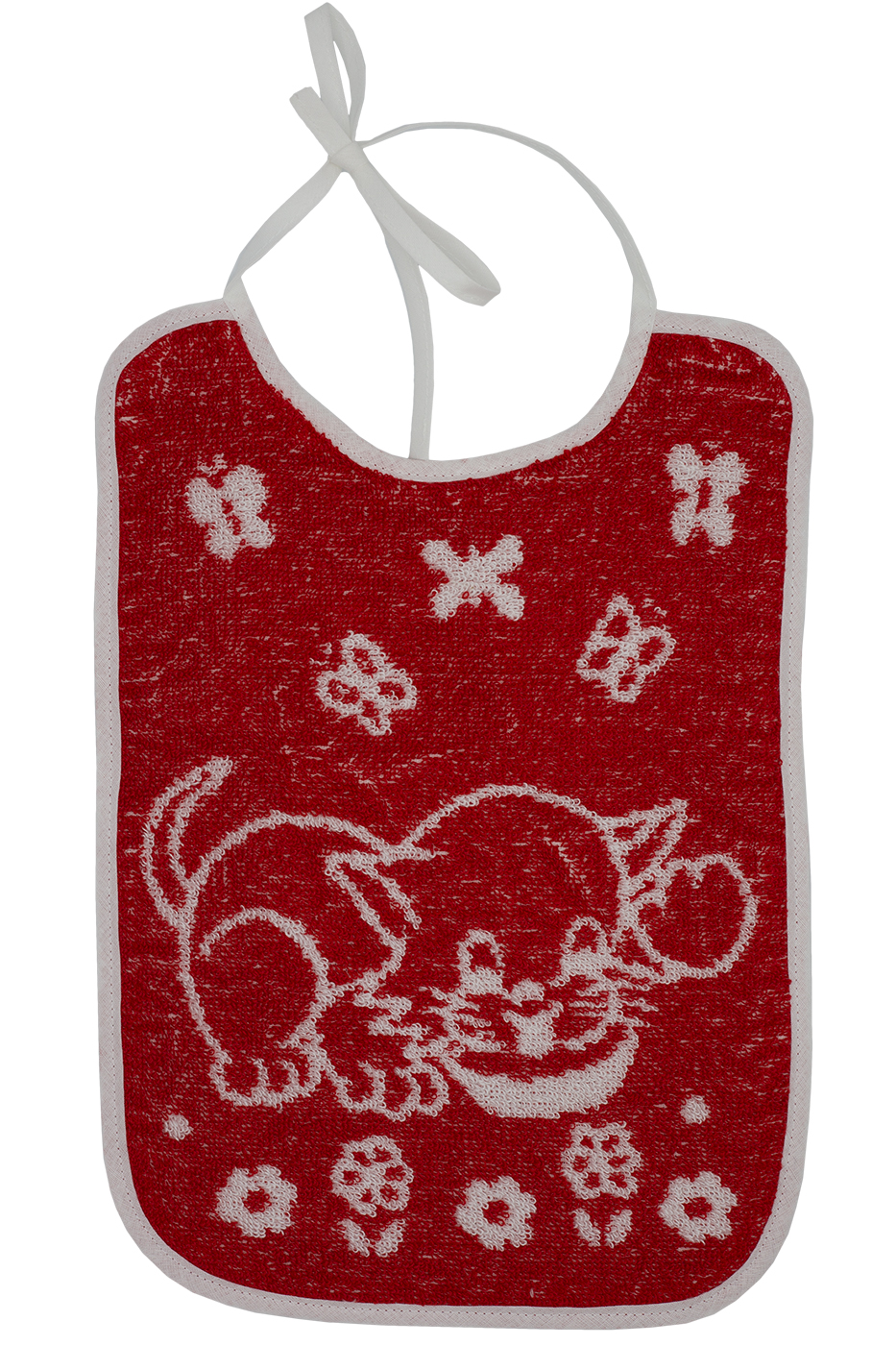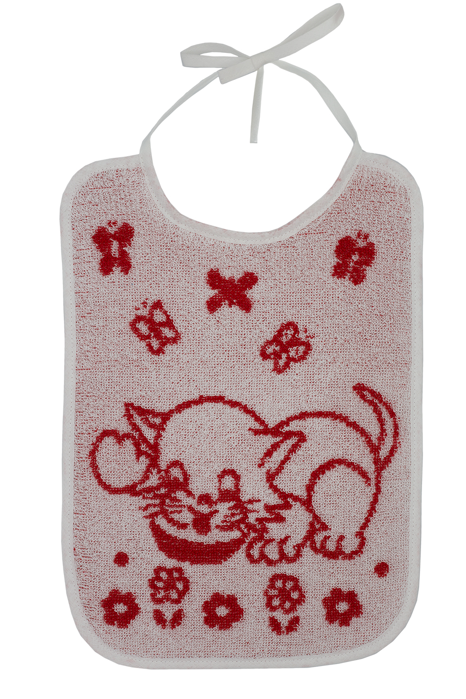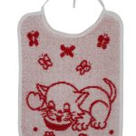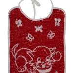Dětský bryndák kočička červená na zavazování. Materiál: 100% bavlna froté. Praní: na 90°C. Rozměr: 25 x 35cm.
