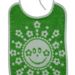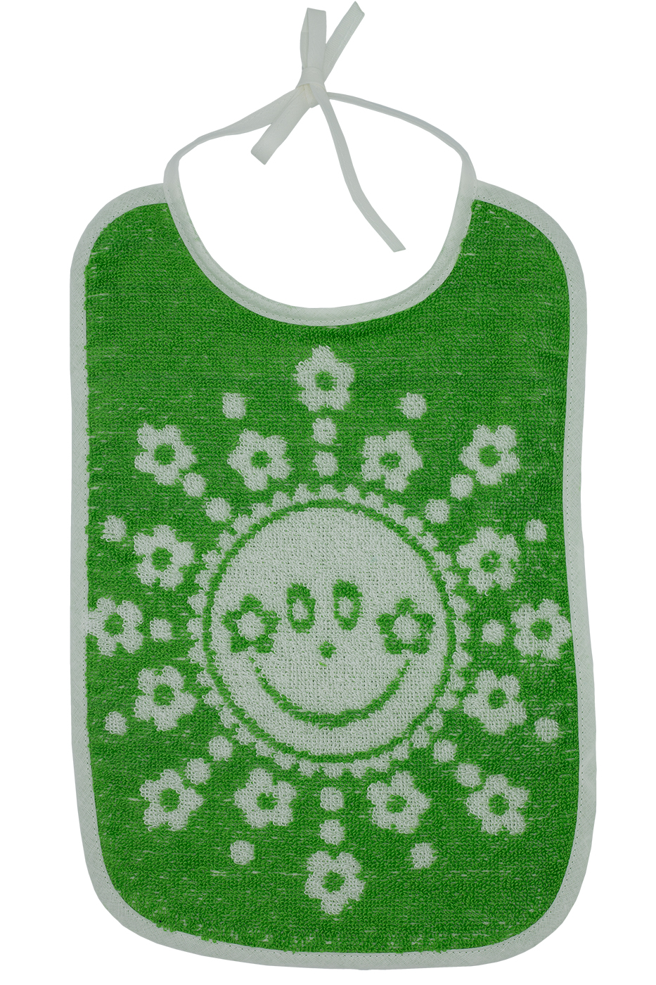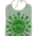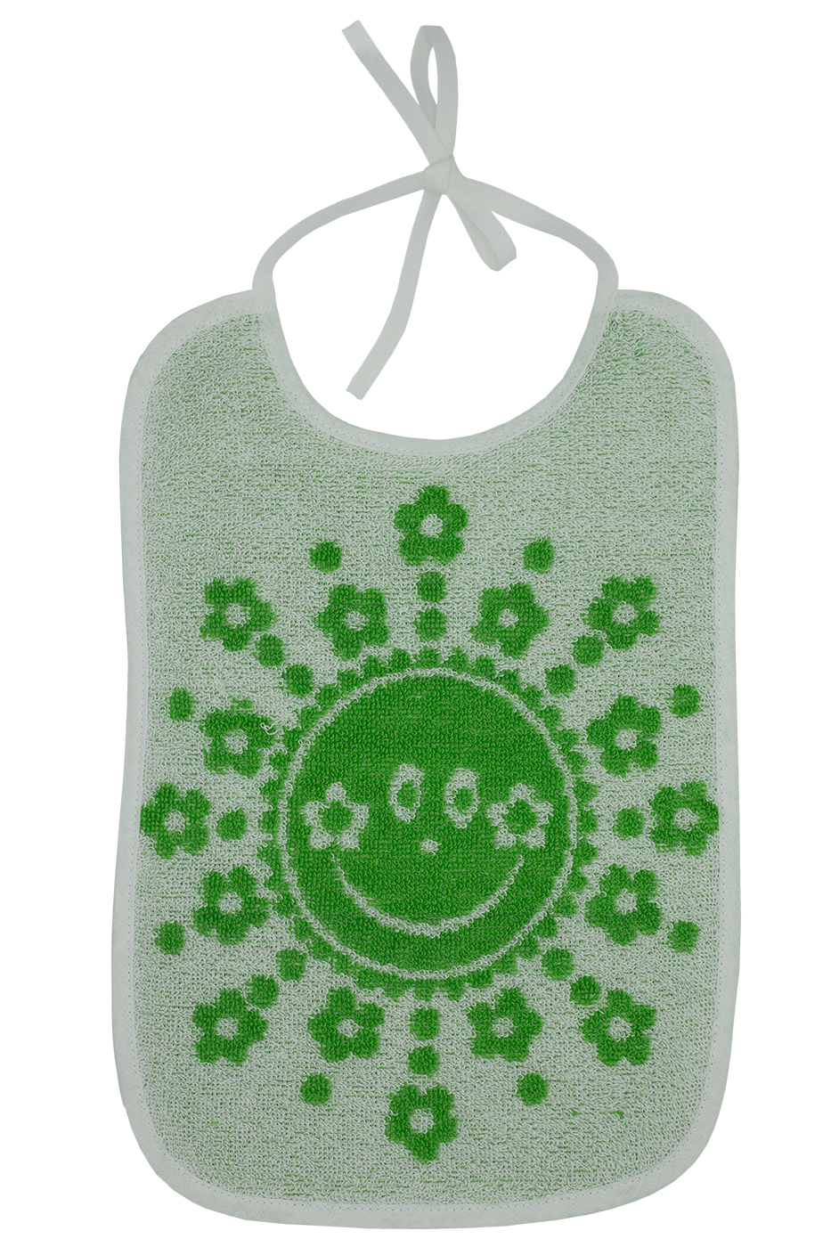 Dětský bryndák sluníčko zelené na zavazování. Materiál: 100% bavlna froté. Praní: na 90°C. Rozměr: 25 x 35cm.