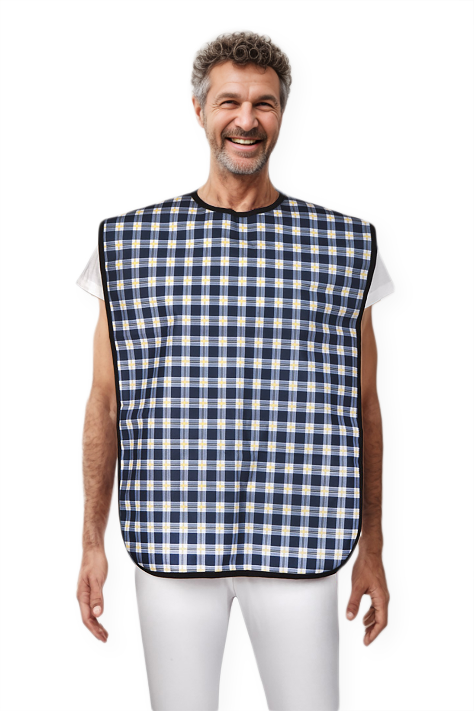 Bryndák pro dospělé a seniory, nepropustný 3-vrstvý s PU membránou a zapínáním na patenty za krkem výborně ochrání oděv před znečištěním, i proto že je dostatečně velký. Rozměr: 50 x 85 cm. Materiál: 100% polyester s PU membránou. Balení: 1 kus. Praní: na 60°C.