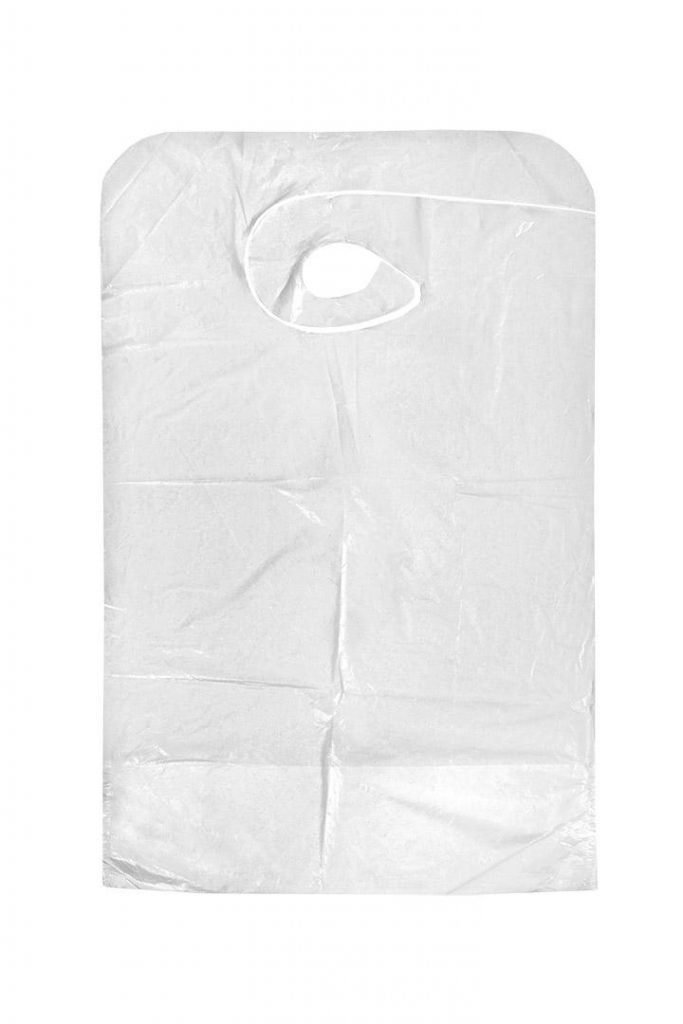 Jednorázový bryndák pro dospělé a seniory igelitové se zavazováním za krk, mají 9cm záchytný pás. Materiál: bílý PE / igelit. Rozměr: 41 x 61cm. Balení: 100 kusů v PE sáčku / 1000 kusů v kartonu.