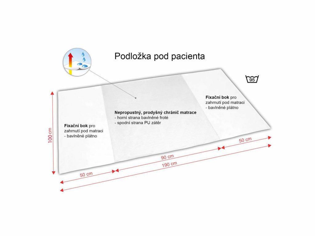 Nepropustná podložka do postele pod pacienta s fixačními boky je určen hlavně pro ležící pacienty, kde není nutné chránit celou matraci, ale hlavně místo možného znečištění. Složení: bavlněné froté rozměr (vrchní strana) prodyšný a nepropustný polyuretanový zátěr (spodní strana), bavlněné plátno (fixační boky pro zahrnutí pod matraci). Možnost praní až na 95°C. Nepropustná podložka do postele lze použít i do dětské postýlky. Nepropustná podložka do postele a postýlky sníží náklady na udržování lůžky a zároveň prodlouží životnost matrace. Rozměry podložky viz. obrázek ve fotogalerii. Praní na 95°C. Rozměr: 190x100cm