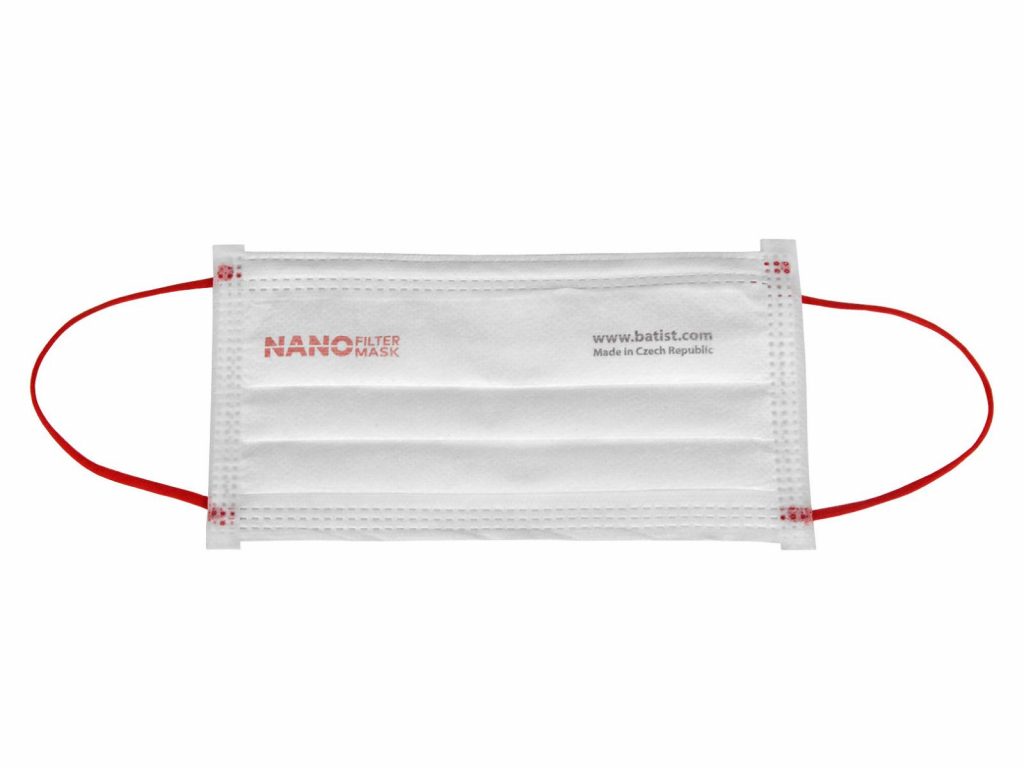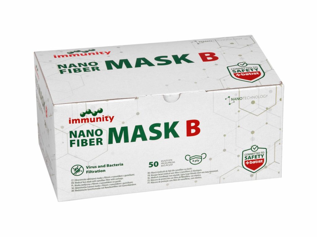 Jednorázové nano roušky 4vrstvé s filtrem z Nanovláken, které jsou určena pro ochranu dýchacích cest a okolí proti šíření virové či bakteriální infekce. Materiál roušky filtruje viry a bakterie čímž snižuje riziko přenosu infekcí z uživatele na okolí. Materiál: Vnější vrstva: Netkaná textilie Polypropylen, spunbond. Filtr: Netkaná textilie Polypropylen, meltblown + vrstva Nanovlákna PVDF. Vnitřní vrstva: Netkaná textilie Polypropylen, spunbond. Nosní výstuž: železný drátek dvojitý, pokrytý plastem. Biologické parametry: EN ISO 10993-5 EN ISO 10993-5, 10. Norma: EN 14683:2019+AC – type II R. Filtrační účinnost BFE 98%. Rozměry: 100mm šíře, 180mm délka. Balení: 50 kusů v krabičce, 1000 kusů v kartonu.