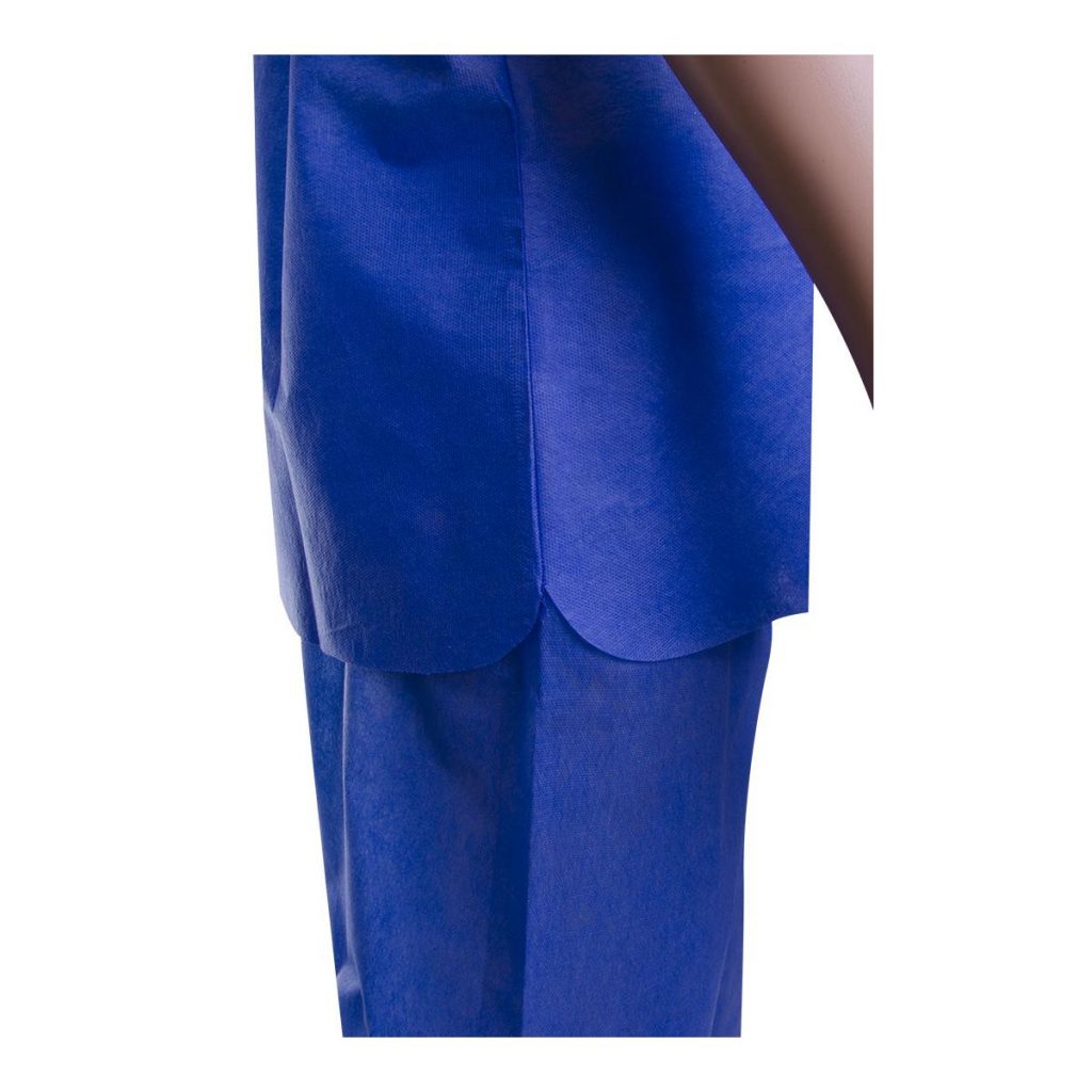 Jednorázový komplet SMS nesterilní vyrábíme z kompozitní netkané textilie SMS v modré barvě. Tento materiál je díky specifickému vrstvenému materiálu unikátní mezi netkanými textiliemi. Důmyslným spojením vrstev materiálů Spunbond a Meltblown je dosaženo výborných vlastností jako je vysoká pevnost, tvarová stálost, hebkost, ale také lehkost i prodyšnost, což je pro váš komfort a pohodlné nošení důležité. Materiál: 100% PP 30g/m2. Balení: 1 set = halena + kalhoty v PE sáčku.