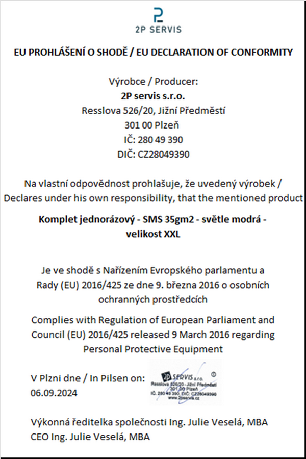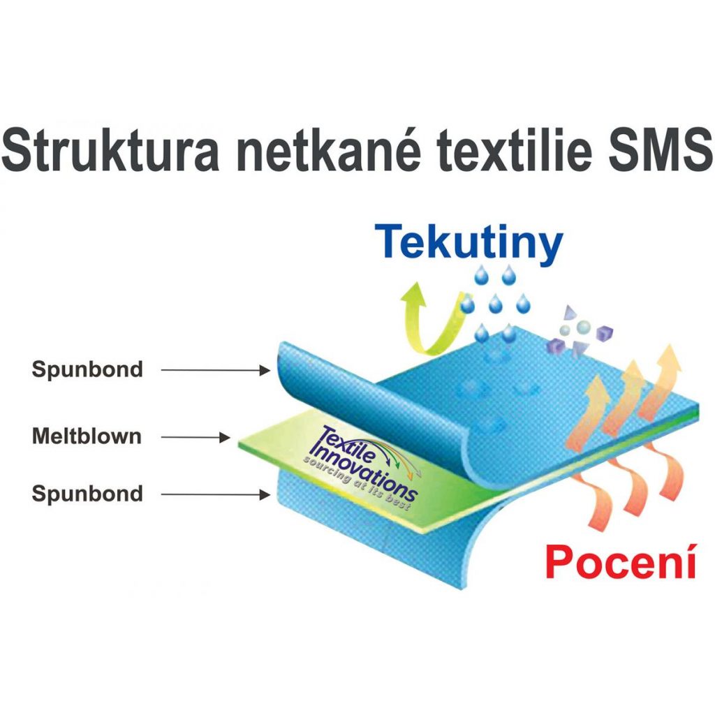 - vysoce kvalitní materiál SMS – vrstvená netkaná textilie spunbond a meltblown