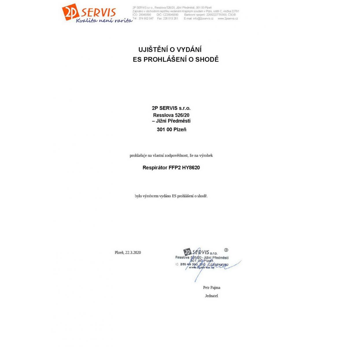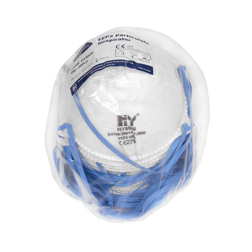 Ochranný respirátor FFP2 HY8620 je filtrační polomaska s tvarem skořepiny, kdy díky tvarovacímu pásku v nosní části a gumičce kolem hlavy, se respirátor velmi snadno nasadí a dobře drží. Respirátor je vyráběn v souladu s nařízením OOP (EU) 2016/425 a s harmonizovanou normou EN 149:2001+A1:2009. Balení: 20 kusů v PE pytlíku.