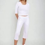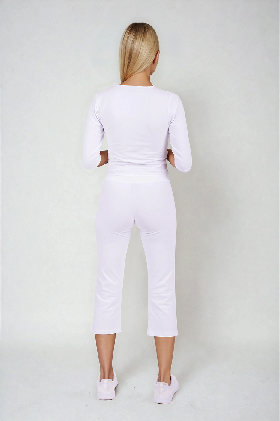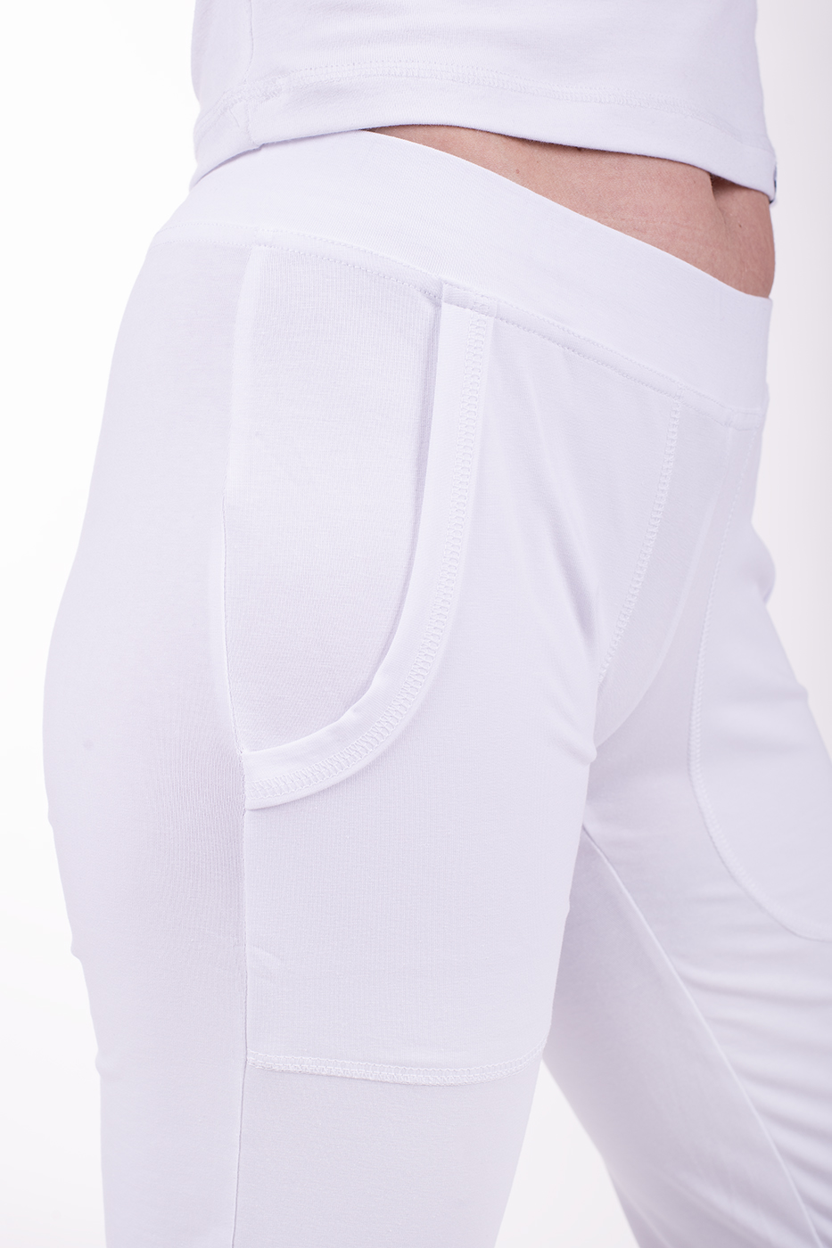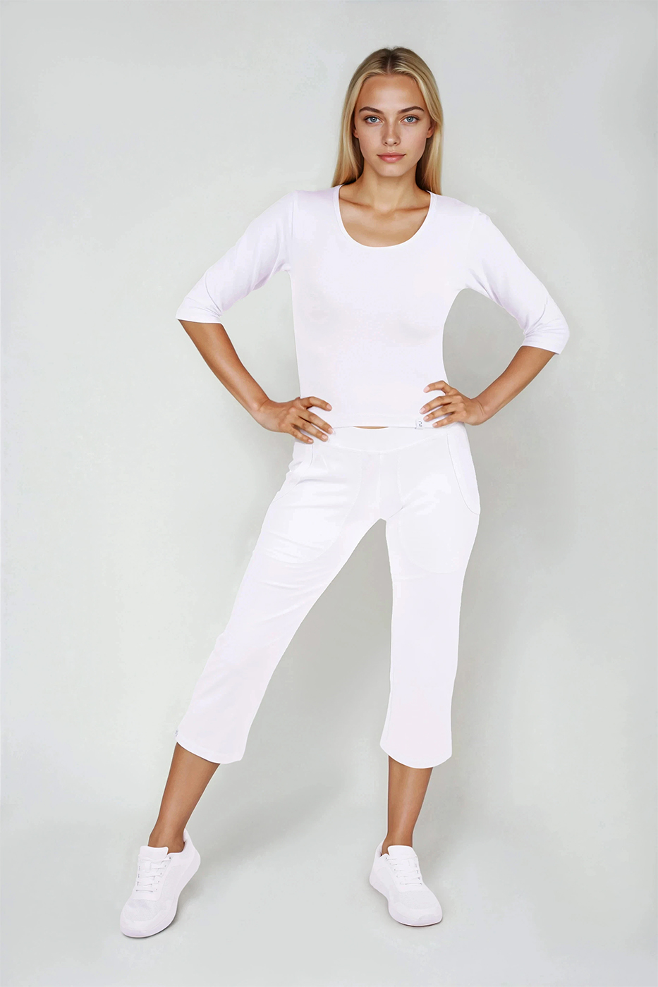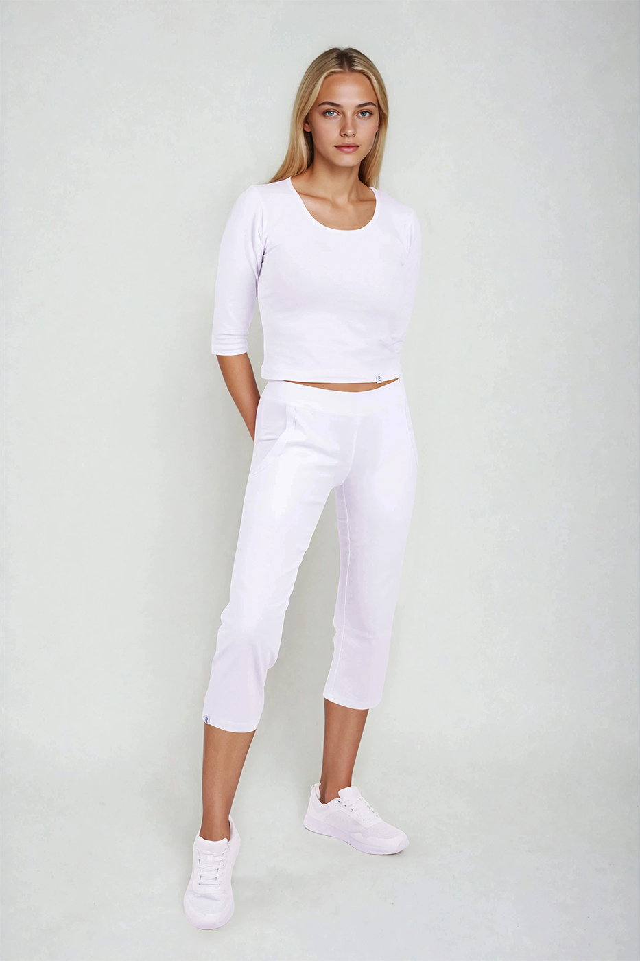3/4 elastické kalhoty Brazil bílé dámské s nakládanými kapsami, vypasované, z velmi příjemného a zdravotně nezávadného směsového materiálu.
