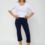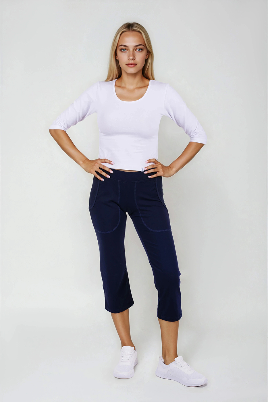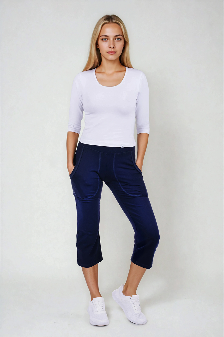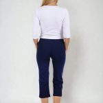3/4 elastické kalhoty Brazil tmavě modré dámské s nakládanými kapsami, vypasované, z velmi příjemného a zdravotně nezávadného směsového materiálu.