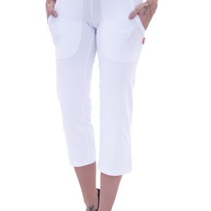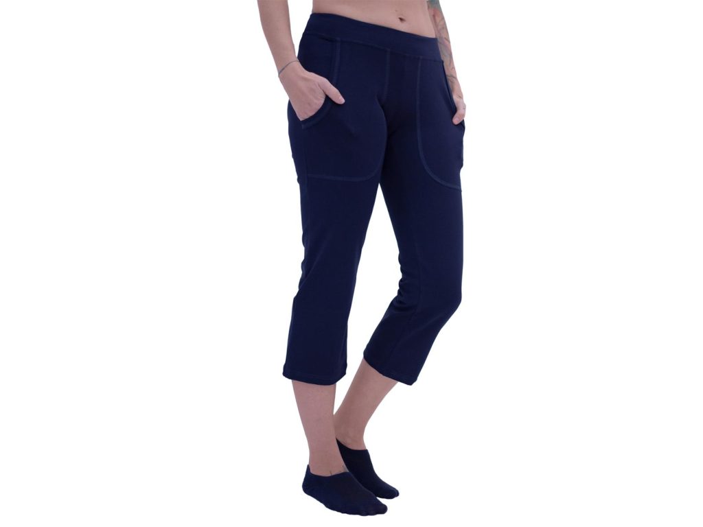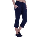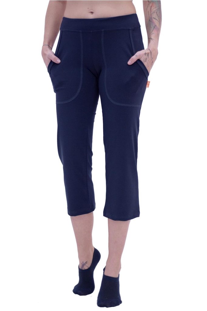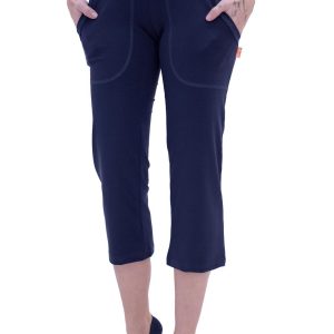 3/4 elastické kalhoty Brazil tmavě modré dámské s nakládanými kapsami, vypasované, z velmi příjemného a zdravotně nezávadného směsového materiálu. Materiál: 92% bavlna, 8% elastan, 210g/m2. Praní: na 40°C.
