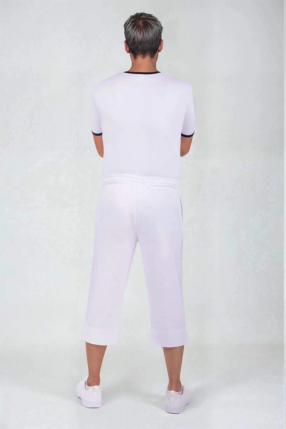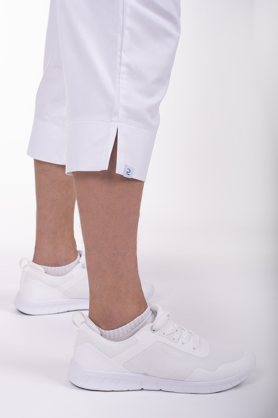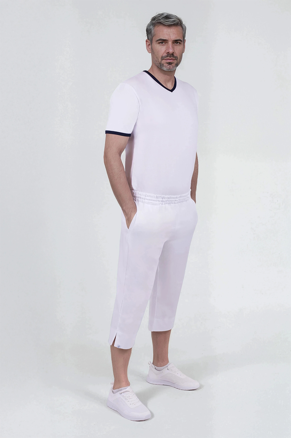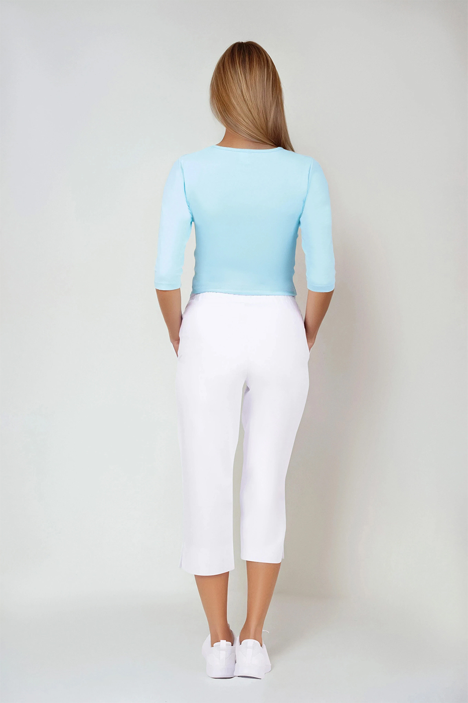 3/4 pracovní kalhoty bílé Uni Capri mají v pase 2 vyměnitelné gumy a 1 stahovací šňůrku, 2 švové kapsy a na koncích nohavic krátké rozparky.