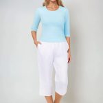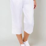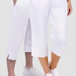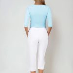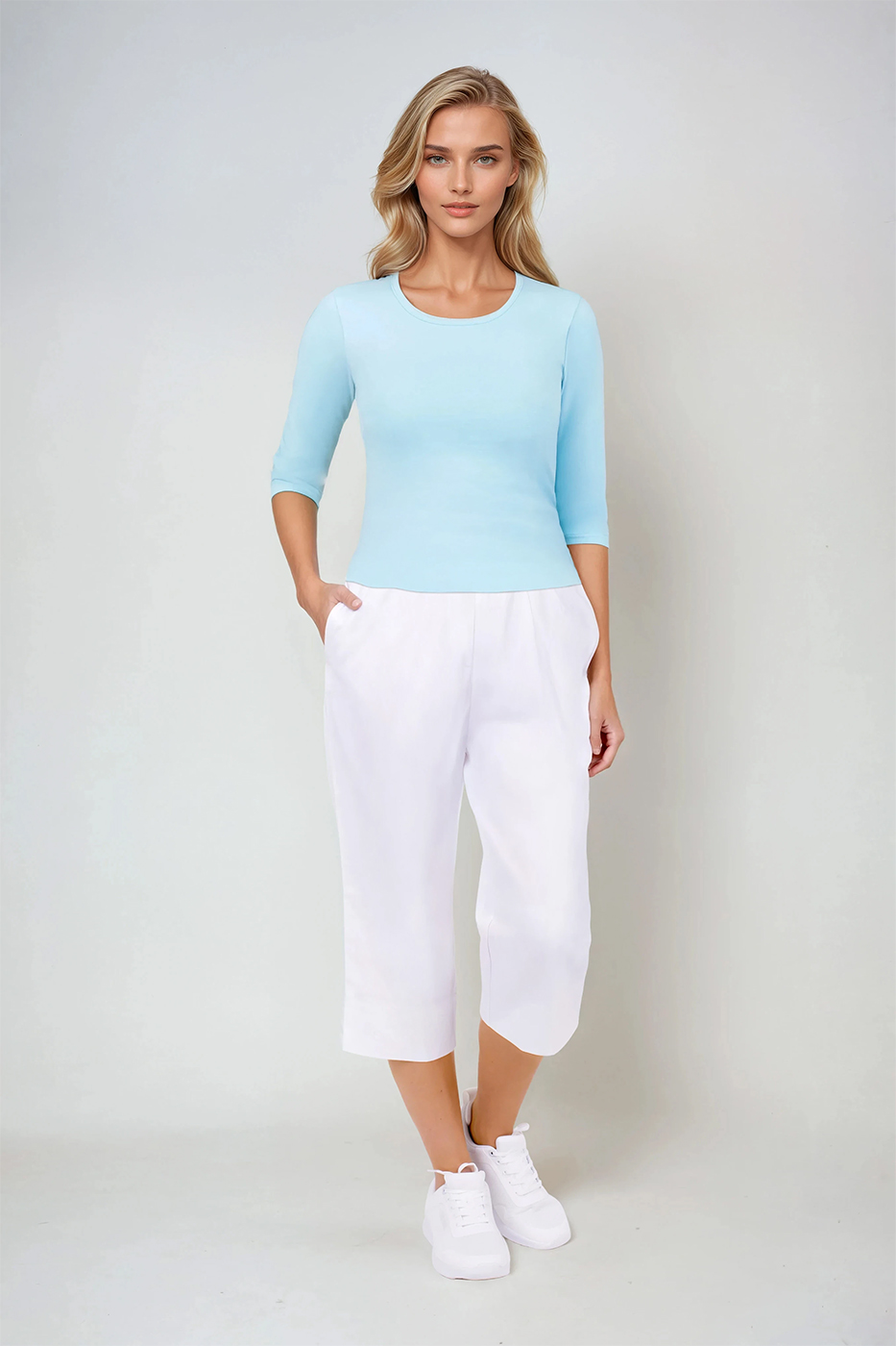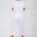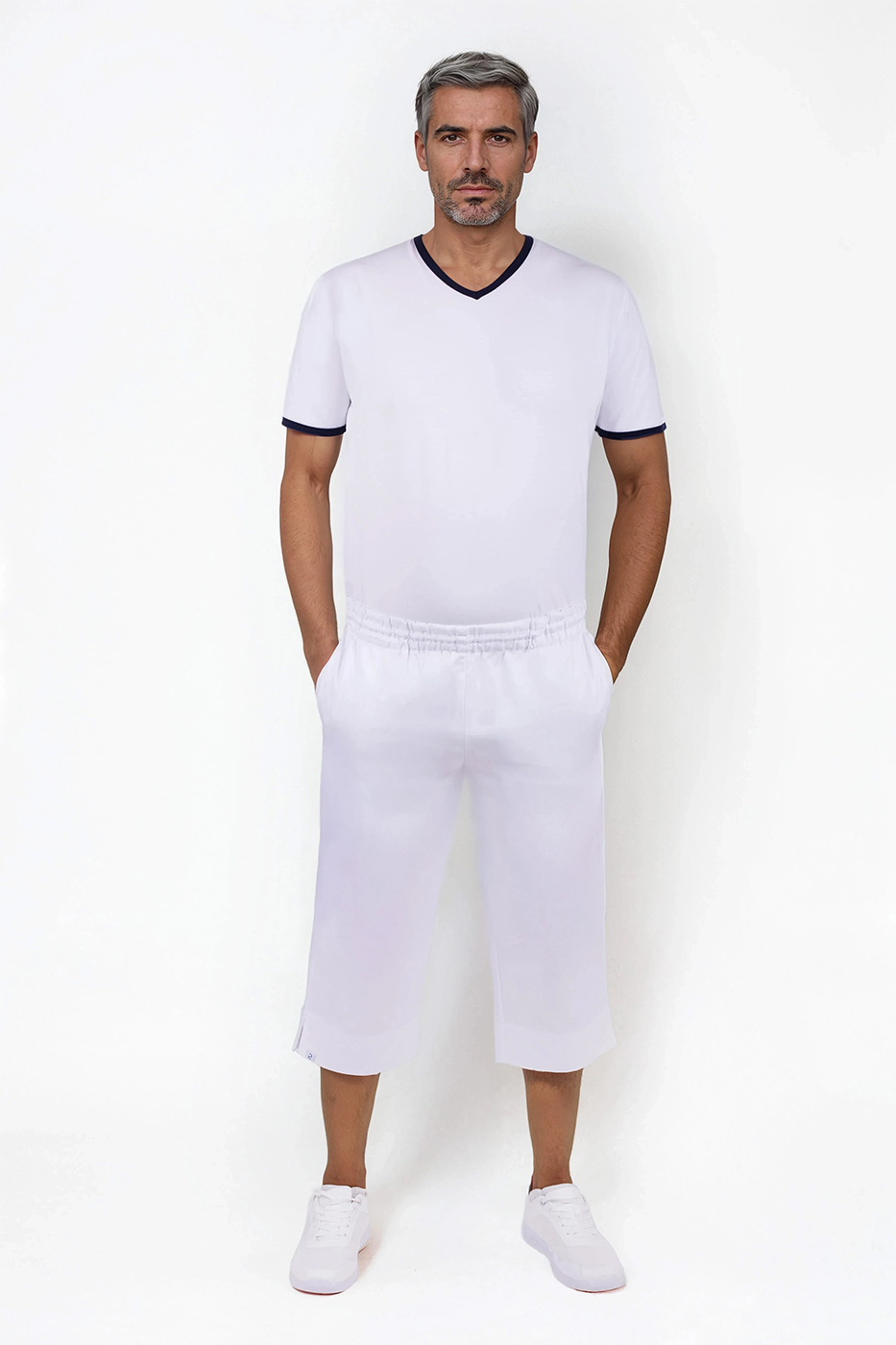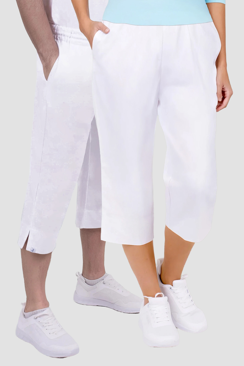 3/4 pracovní kalhoty bílé Uni Capri mají v pase 2 vyměnitelné gumy a 1 stahovací šňůrku, 2 švové kapsy a na koncích nohavic krátké rozparky.
