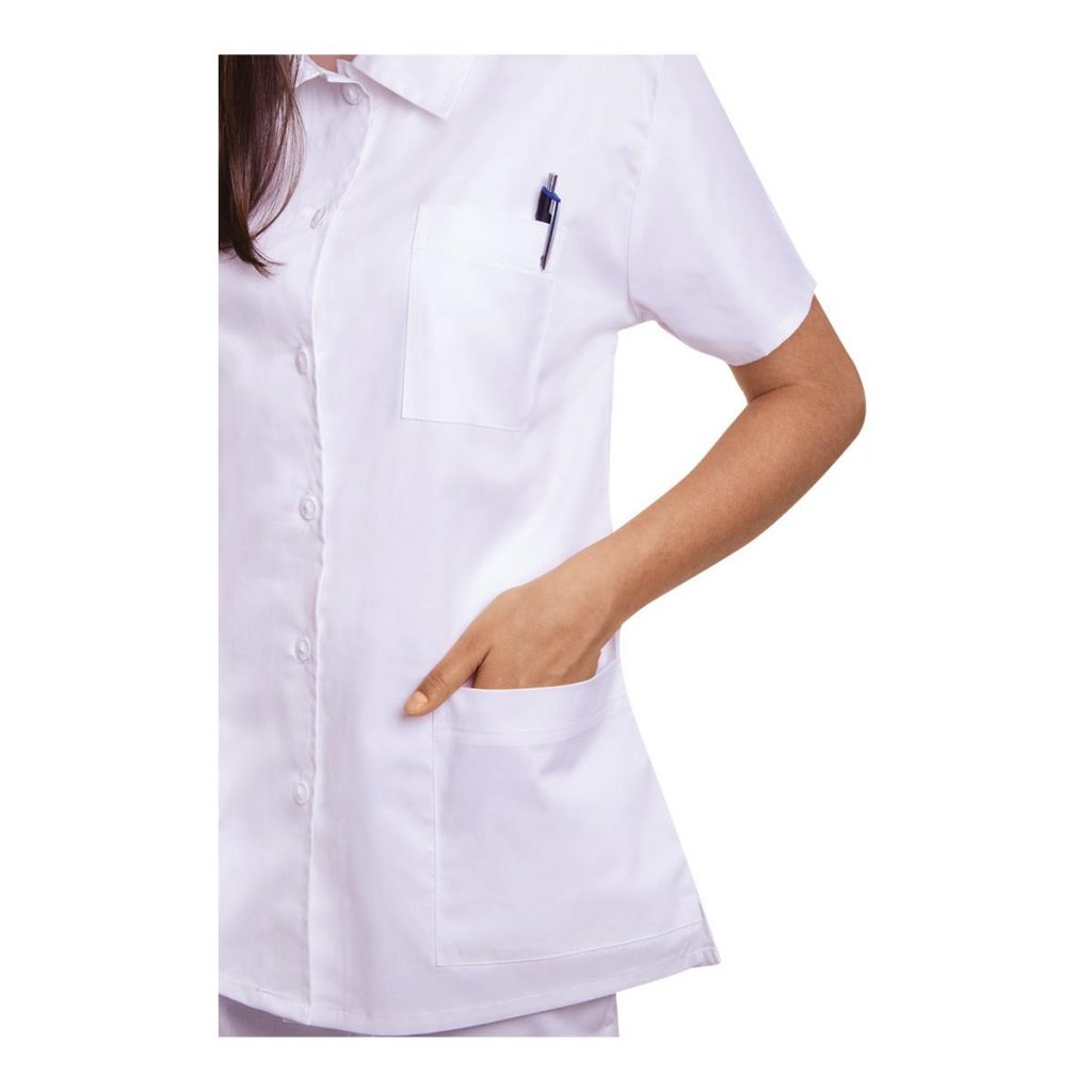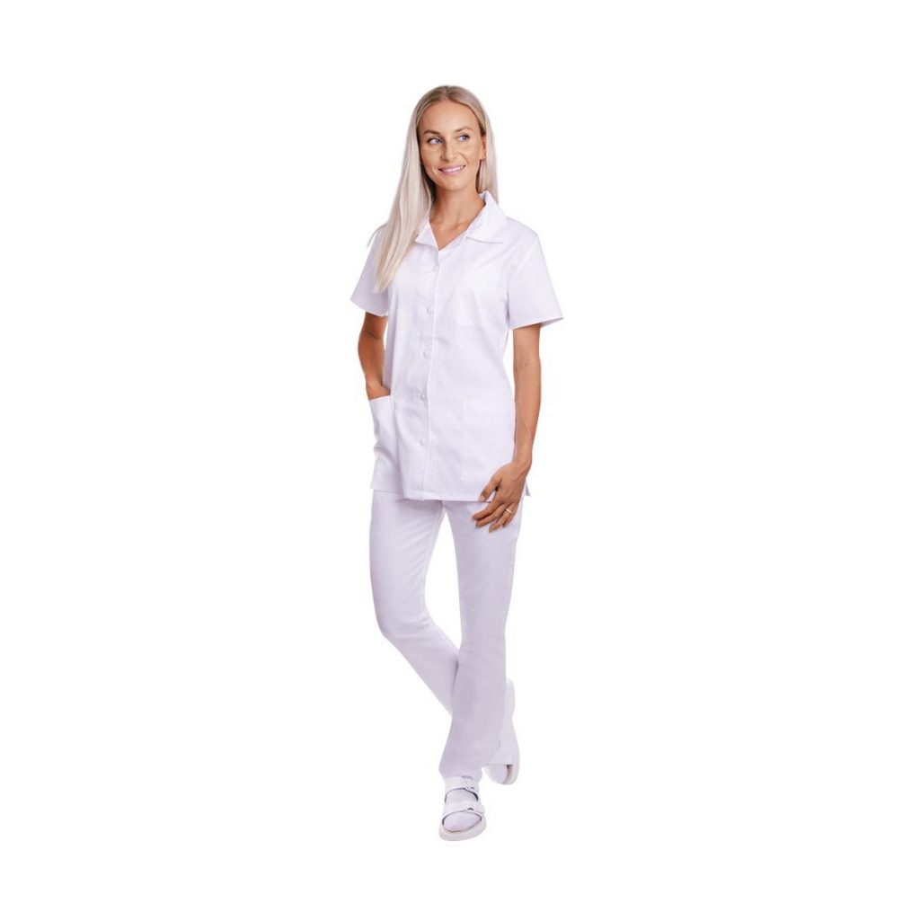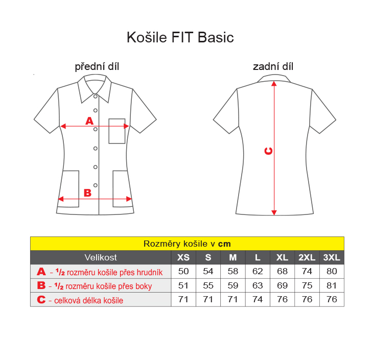 Bílá košile dámská Fit Basic má celopropínací zapínání na knoflíky a prakticky prostorné kapsy. Materiál: 100% bavlna kepr 160g/m2. Praní: na 95°C.