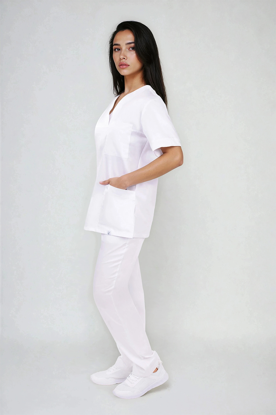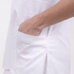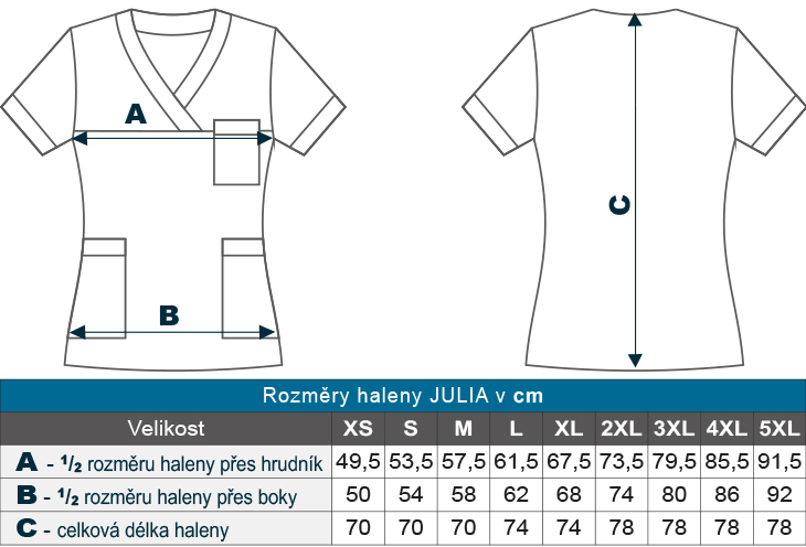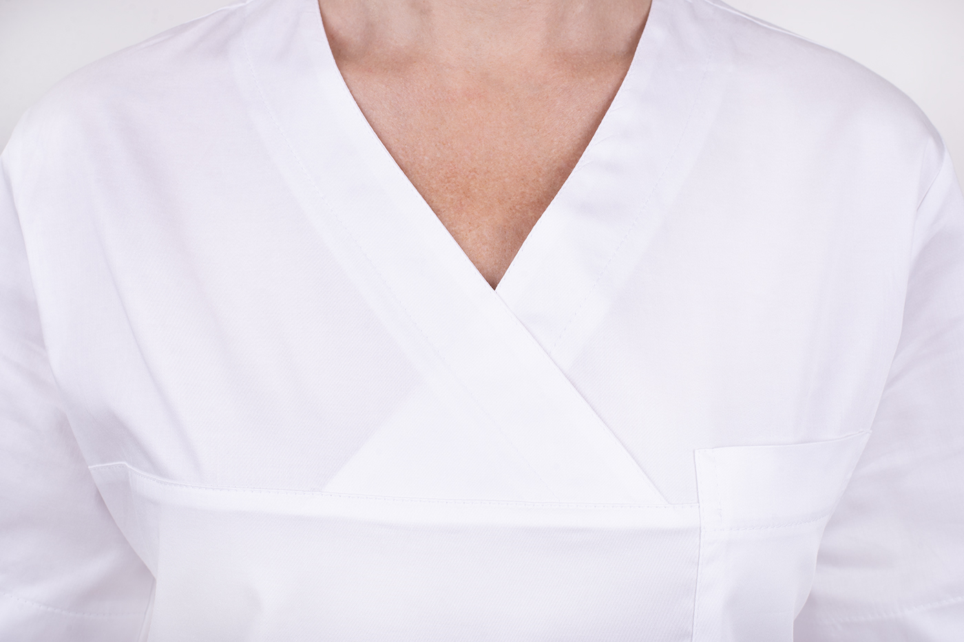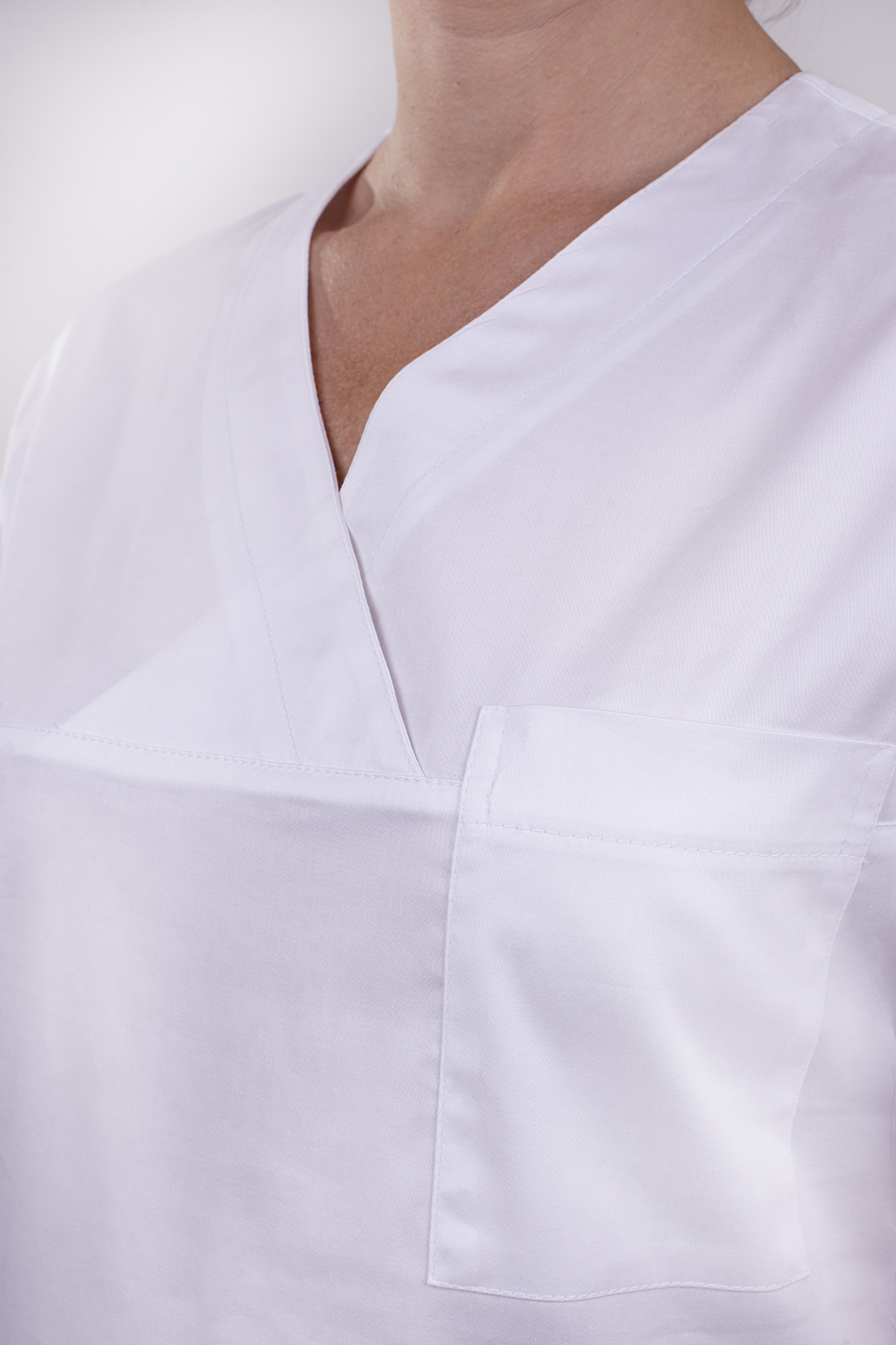 Dámská bílá pracovní halena Julia je navržena tak, aby dokonale padla každé postavě. Její délka do poloviny stehen a projmutý střih zvýrazňují ženskou siluetu, aniž by omezovaly v pohybu. Díky praktickému výstřihu do „V“ halena nejen lichotí dekoltu, ale zároveň poskytuje dostatek prostoru pro pohodlné oblékání. Oblékání přes hlavu je klasické, spolehlivé a usnadňuje manipulaci i při častém převlékání.