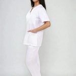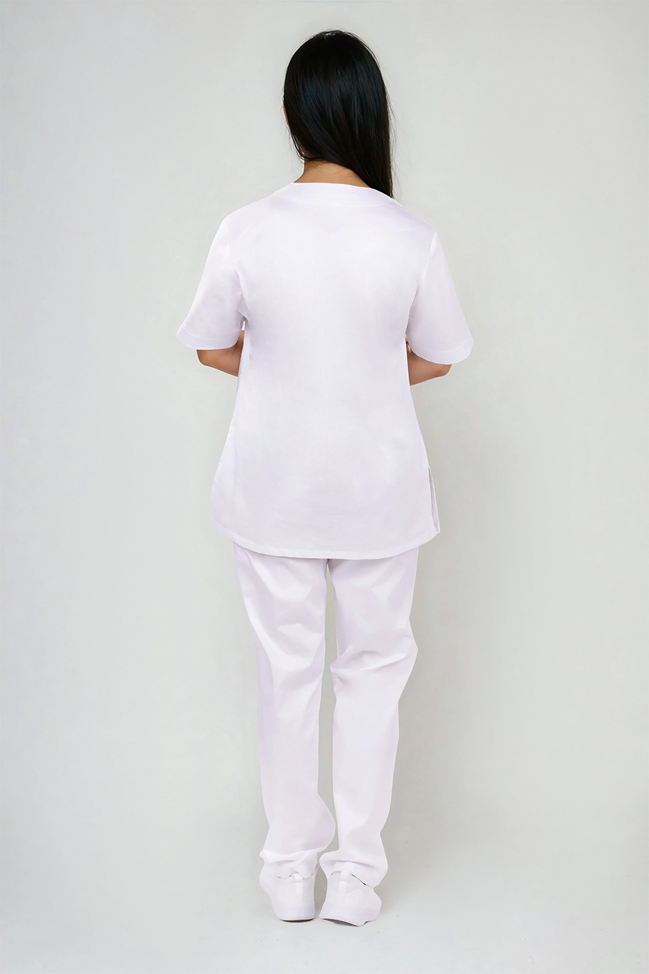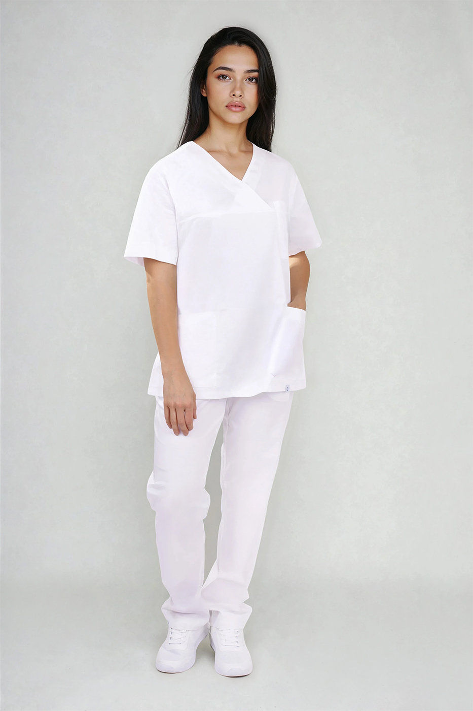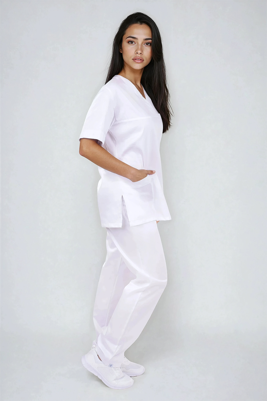 Dámská bílá pracovní halena Julia je navržena tak, aby dokonale padla každé postavě. Její délka do poloviny stehen a projmutý střih zvýrazňují ženskou siluetu, aniž by omezovaly v pohybu. Díky praktickému výstřihu do „V“ halena nejen lichotí dekoltu, ale zároveň poskytuje dostatek prostoru pro pohodlné oblékání. Oblékání přes hlavu je klasické, spolehlivé a usnadňuje manipulaci i při častém převlékání.