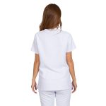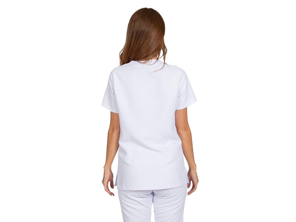 Bílá tunika dámská pracovní Sonia je moderní a funkční oděv nejen pro profesionály. Halena má krátké rukávy, výstřih do V, skryté zapínání na druky a 2 přední kapsy. Haleny jsou dobře prodyšné, odolné vůči postříkání bělidly, jsou rychleschnoucí bez nutnosti žehlení a odpuzují vlasy i srst domácích mazlíčků. Materiál: 100% PES mikrovlákno 148g/m2 s antibakteriální úpravou. Praní: na 90°C.