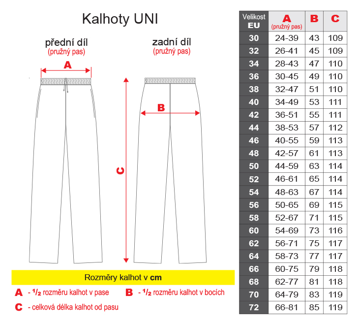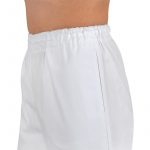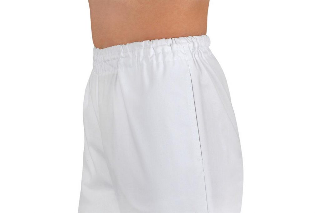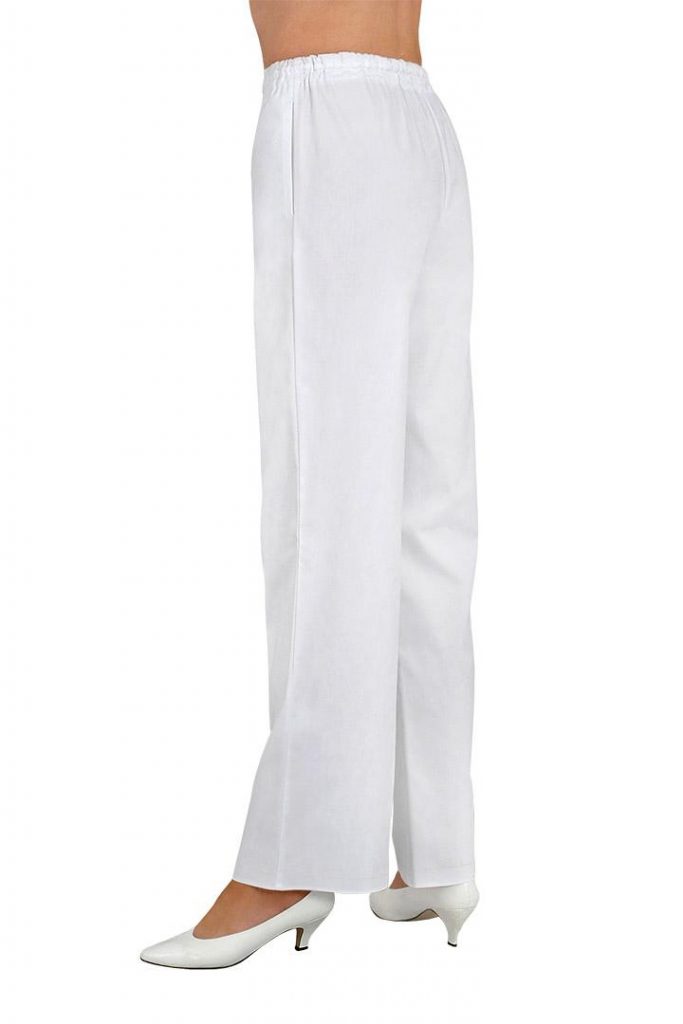 Bílé zdravotnické kalhoty na gumu Uni v pase s dvojitou vyměnitelnou gumou a stahovací šňůrkou pro pohodlné nastavení pasu. Materiál: 100% bavlna, 200g/m2 sanfor., merc., příjemná, vysrážená s keprovou vazbou.