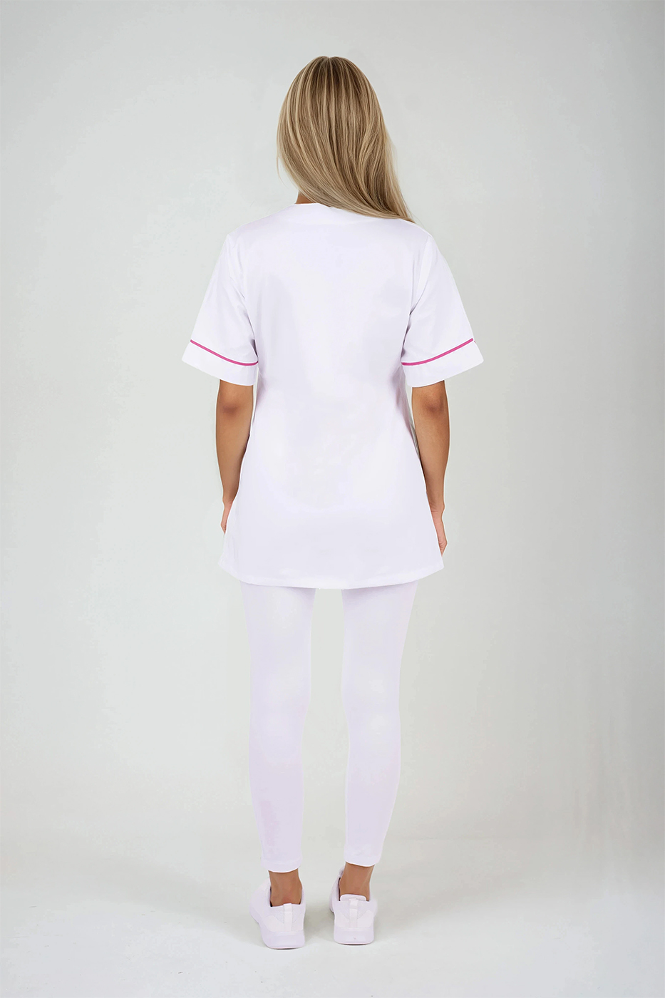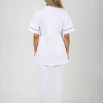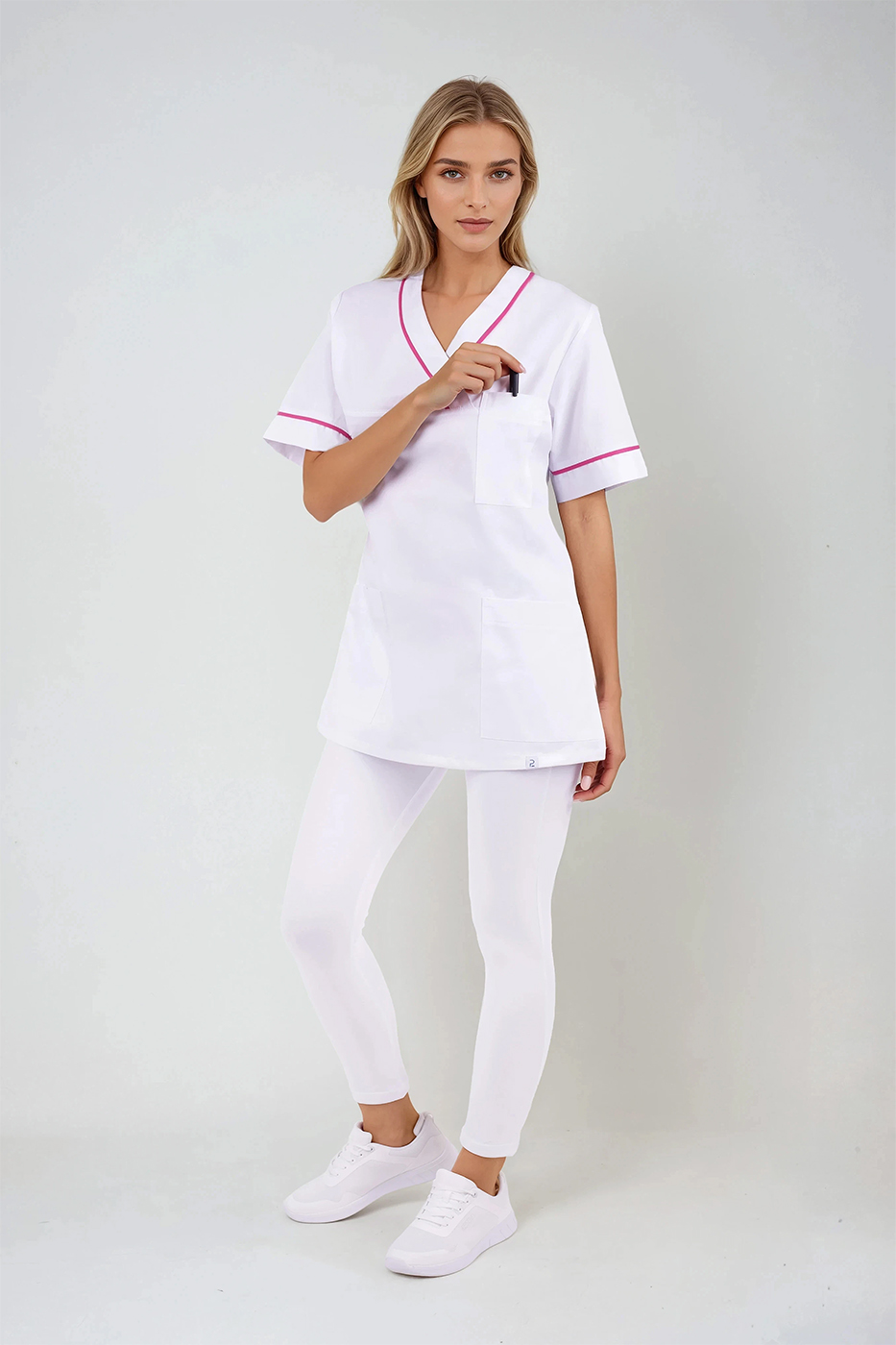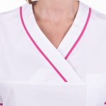 Kontrastní barevné prvky v odstínu jahoda nejen oživují vzhled haleny, ale také ji odlišují od klasického unisex pracovního oblečení. Detaily v barvě jahody se objevují na lemování výstřihu, rukávů a kapsách, čímž vzniká atraktivní, ale stále decentní kombinace. Tato barevná hra přináší do pracovního dne optimismus a ženský styl, ať už v nemocničním provozu, nebo na recepci.