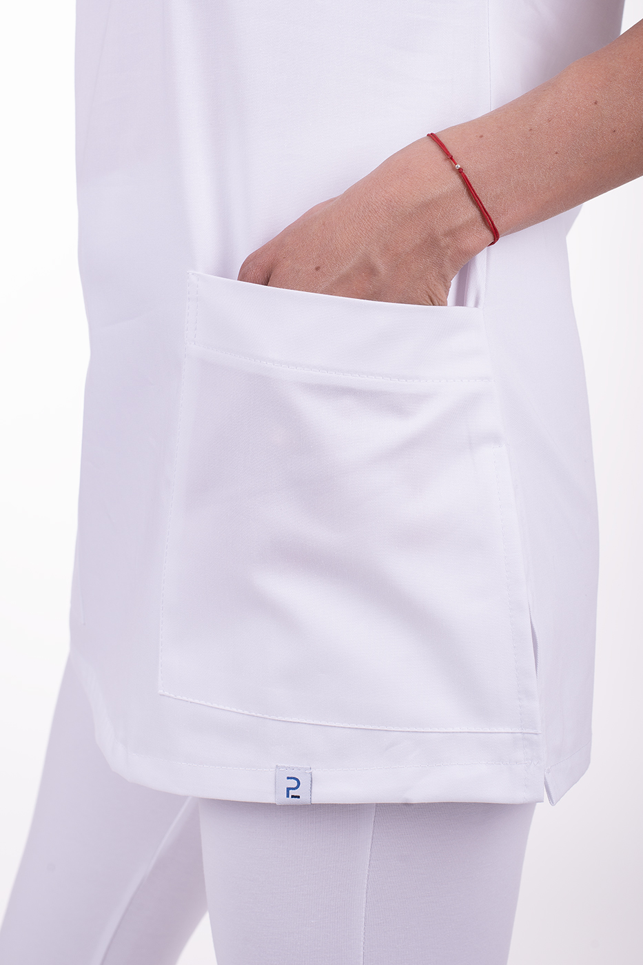 Dámské pracovní haleny Julia-B nejsou jen hezké na pohled – jsou také praktické. Disponují dvěma velkými spodními kapsami, do kterých se vejde vše potřebné od rukavic, roušky až po telefon či poznámkový blok. Náprsní kapsa nabízí další úložný prostor, který ocení každá žena při každodenní práci.
