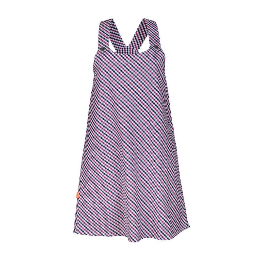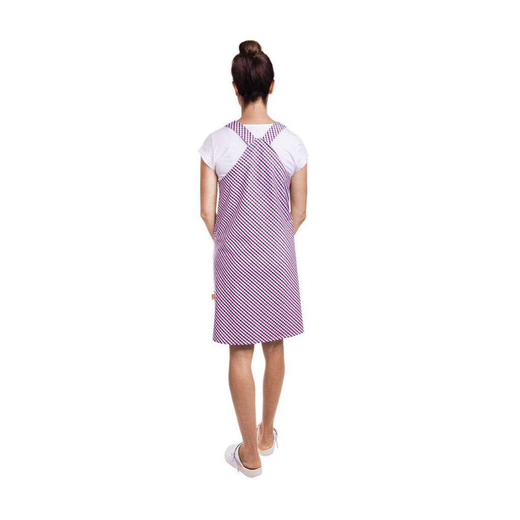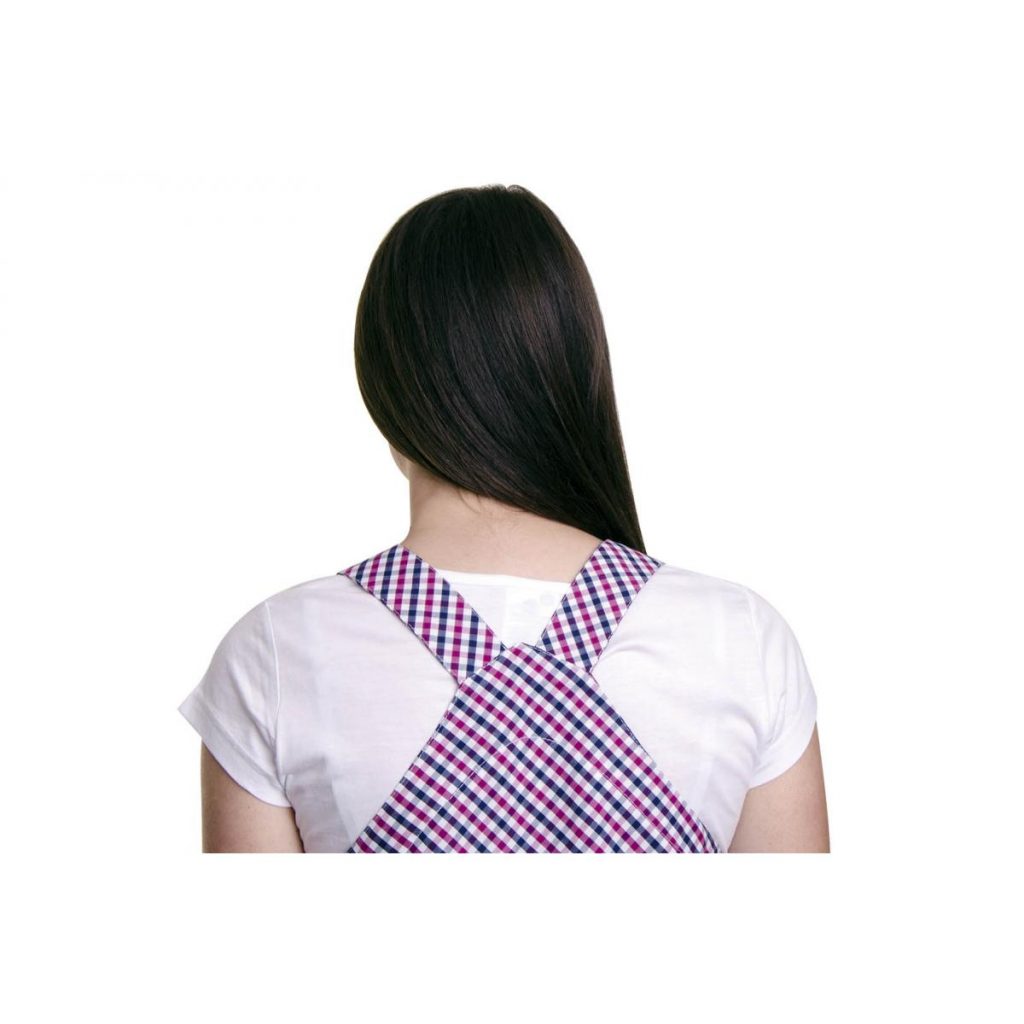 Dámské šaty Ornela káro modro fialová mají pohodlný áčkový střih, u kterého jsou jednotlivé díly střiženy na koso čímž je dosaženo požadované pružnosti a splývavosti. Šaty nemají záševky, na širších ramínkách je ozdobné zapínání, v bočních švech 2 kapsy a v pase úzký pásek umožňující stažení. Materiál: 100% bavlna, 125g/m2. Praní: na 60°C.