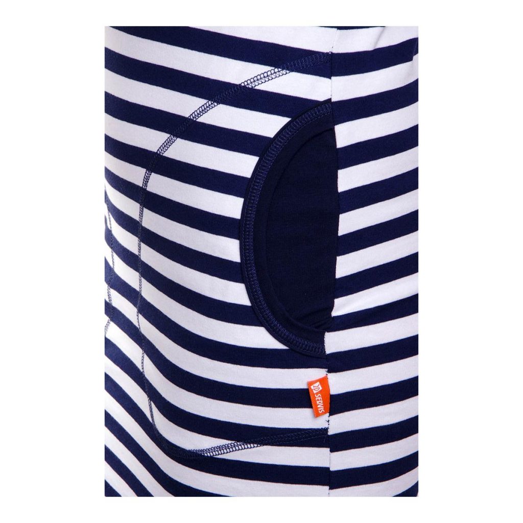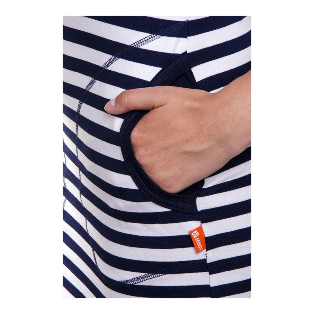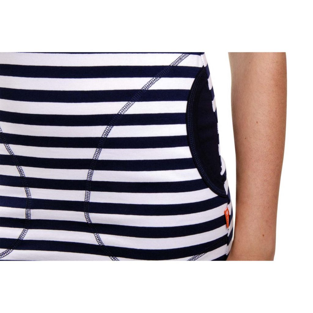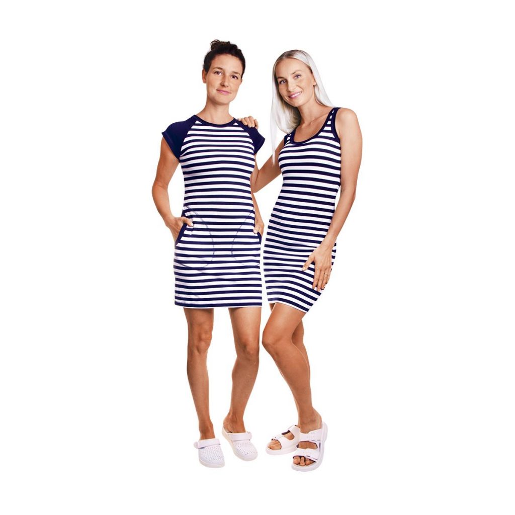 Dámské šaty Mona s kapsami s modro bílým proužkem si vás získají svou elegancí a komfortností. Střih je mírně projmutý a díky příměsí elastanu vám šaty budou výborně sedět. Použitý zdravotně nezávadný materiál vás přímo pohladí po těle. Materiál: 92% bavlna, 8% elastan, 210g/m2. Praní: na 40°C.