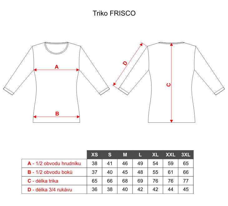 Dámské tričko s tříčtvrtečním rukávem Frisco jahoda s mírně vypasovaným střihem vyrábíme z příjemného, jemného a zdravotně nezávadného materiálu s příměsí elastanu. Praní na 40°C. Materiál: 92% bavlna, 8% elastan, 210g/m2.