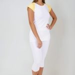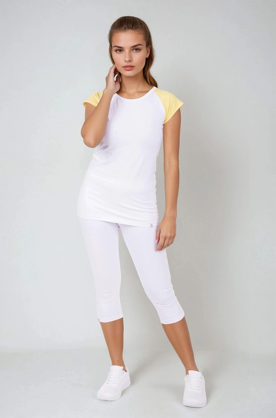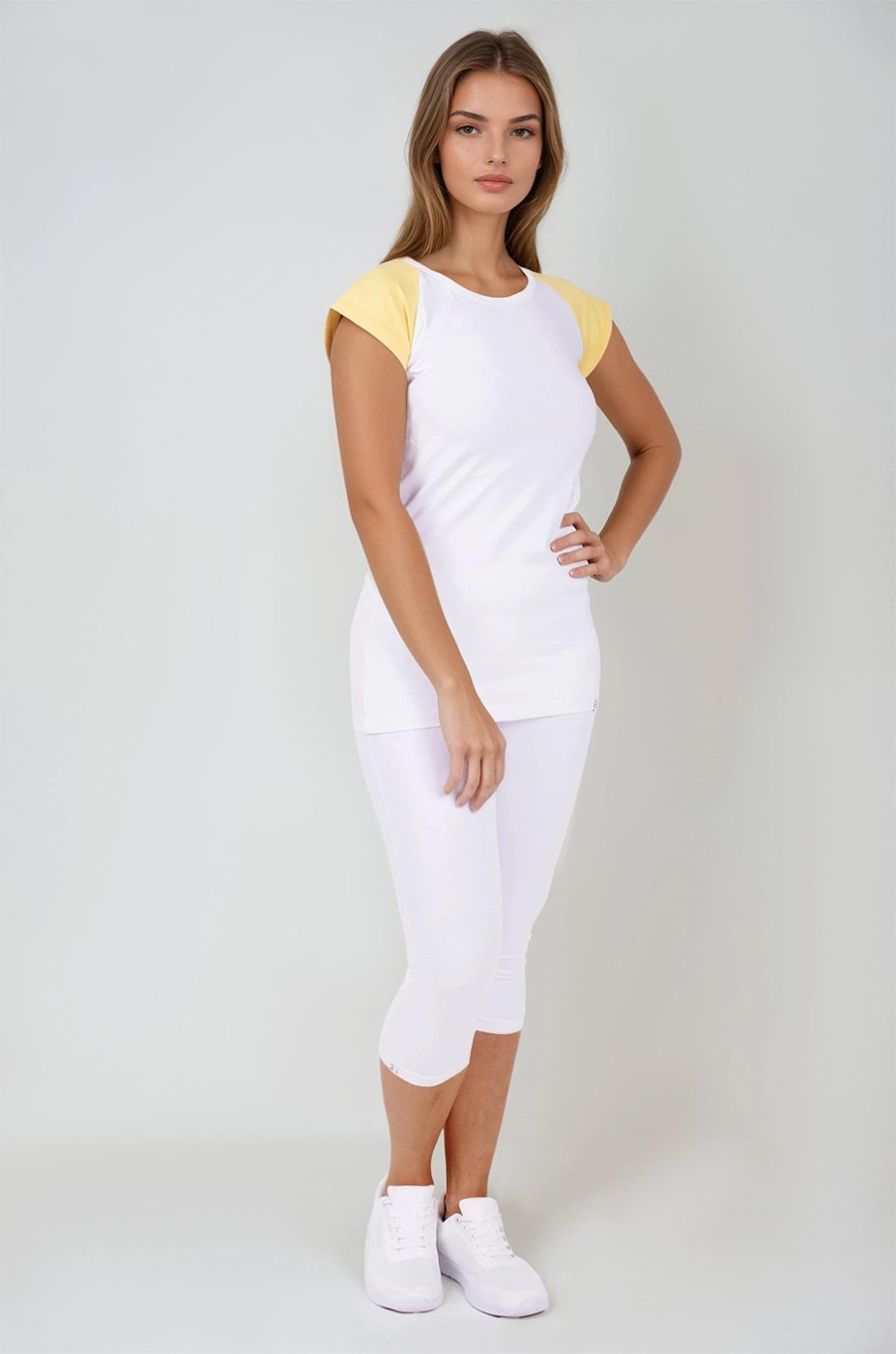 Dámské triko Laguna v barvě bílá/žlutá s lehce tvarovaným střihem a barevnými doplňky šijeme z velmi příjemného, prodyšného a zdravotně nezávadného materiálu. Praní na 40°C. Materiál: 92% bavlna, 8% elastan, 210g/m2.