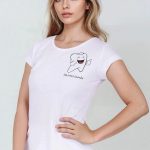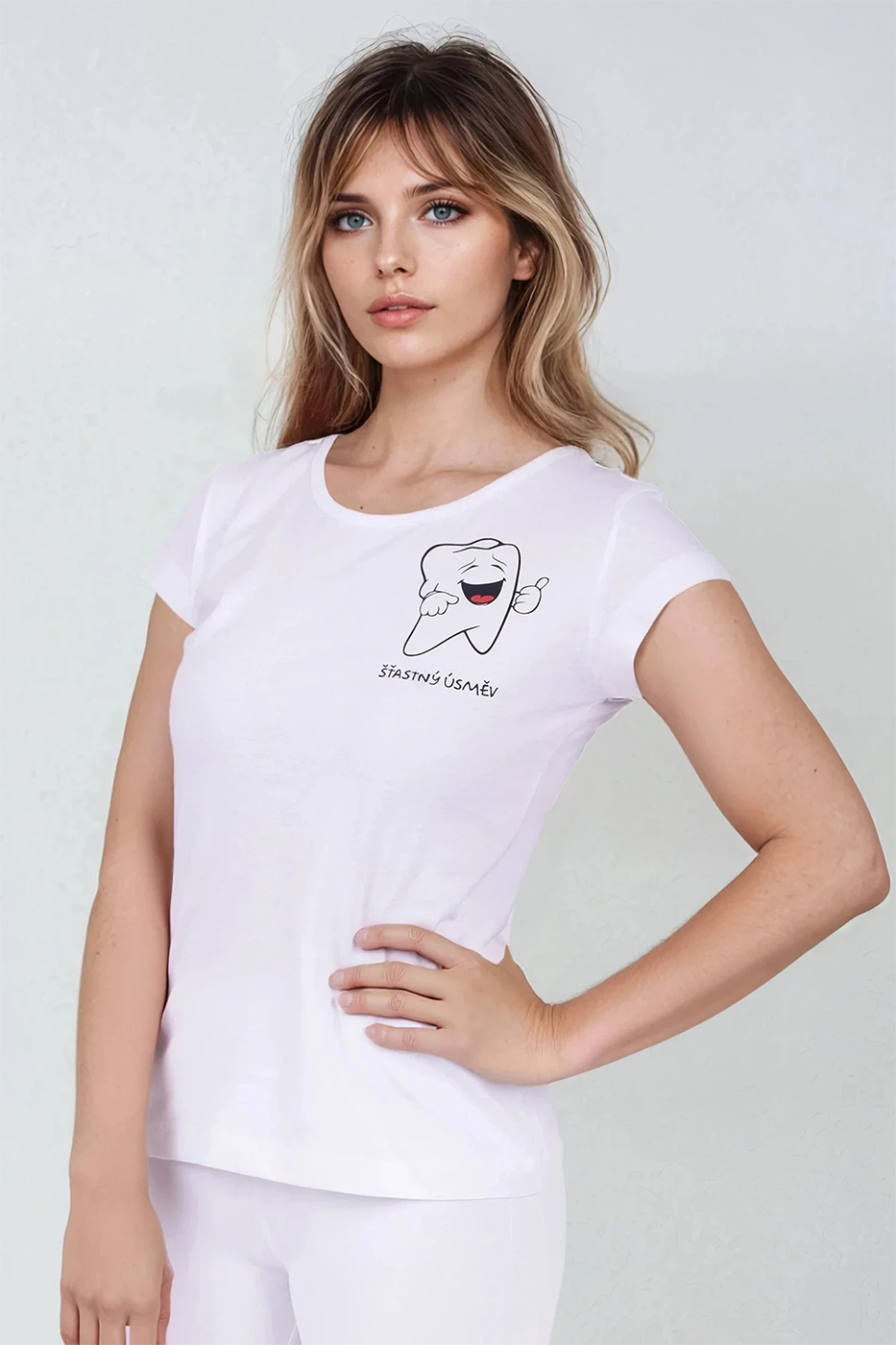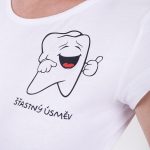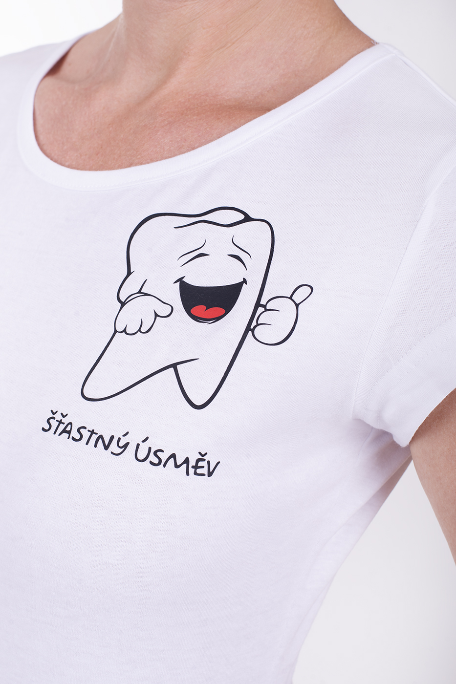 Rádi bychom vám představili dámské triko Šťastný úsměv New. Motiv obrázku mu jasně předurčil místa jeho použití – zubní ordinace a kliniky. Obllékat ho mohou sestřičky i lékařky. Milá kresba rozesmátého zubu pomůže uvolnit napjatou atmosféru, která na těchto místech panuje. K výrobě bílého trika byla zvolena prodyšná a lehká 100% česaná bavlna. Triko s velmi krátkými rukávy má lehce projmutý střih. Exklusivitu vzhledu podtrhuje silikonová úprava. Triko má olemovaný kulatý výstřih. Ramena jsou zpevněná všitým proužkem.