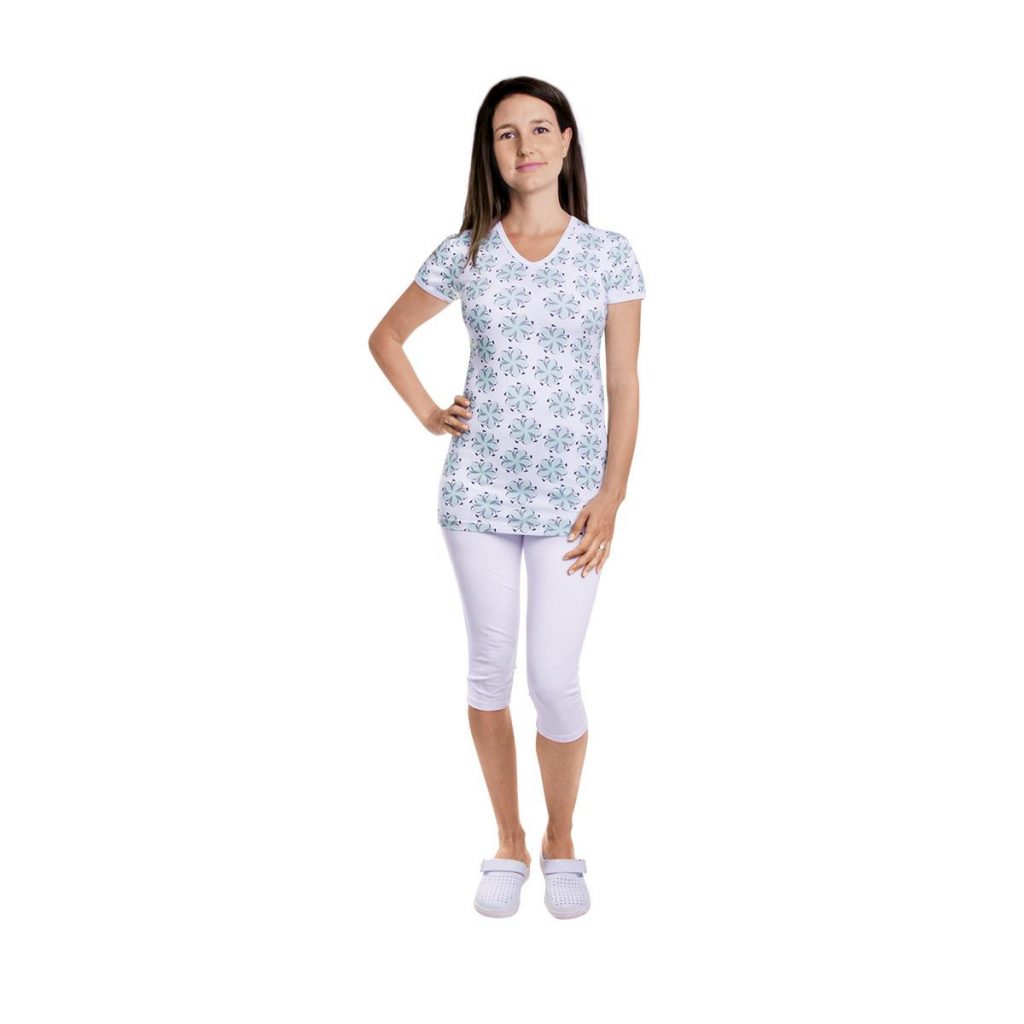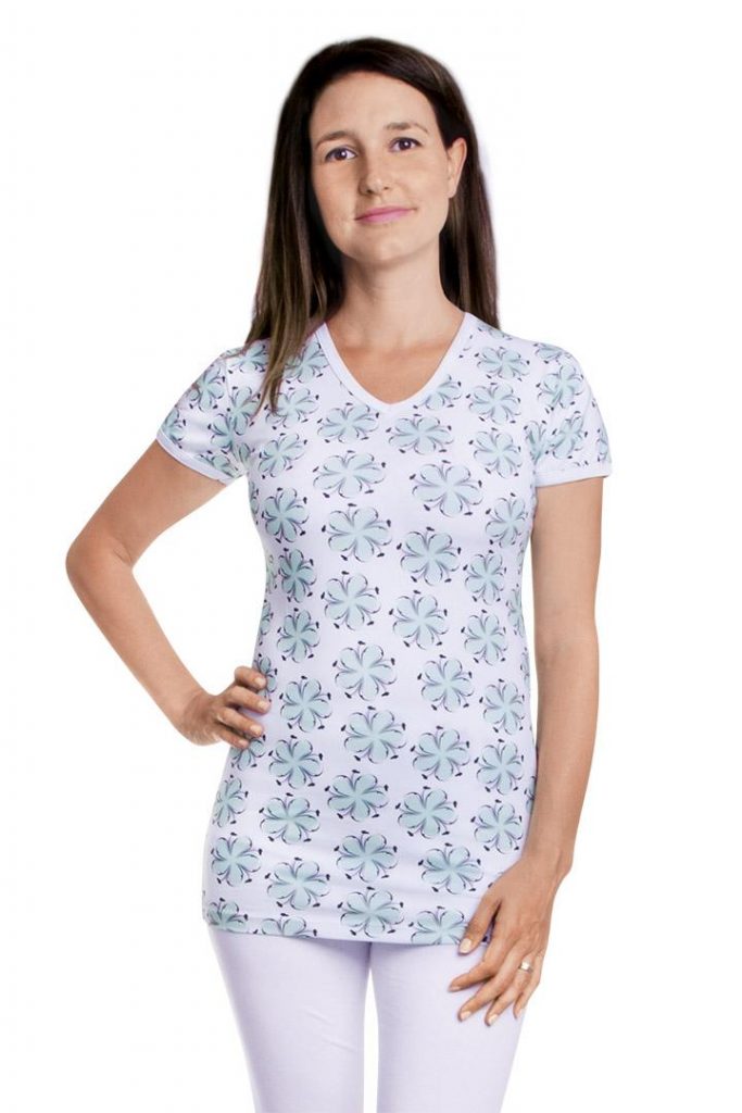 Dámské triko Vito Flora s mentolovým potiskem, výstřihem do V a krátkými rukávy, má lehce projmutý střih, dík kterému je nošení velmi pohodlné a bude vás bavit. Materiál: 92% bavlna 8% elastan, 210g/m2. Praní: na 30°C.