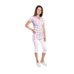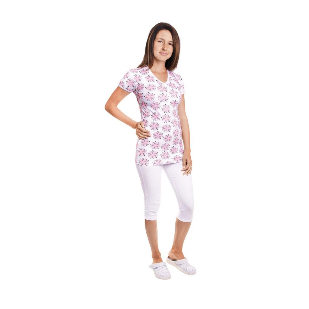 Dámské triko Vito Flora se světle růžovým potiskem, výstřihem do V a krátkými rukávy, má lehce projmutý střih, dík kterému je nošení velmi pohodlné a bude vás bavit. Materiál: 92% bavlna 8% elastan, 210g/m2. Praní: na 30°C.