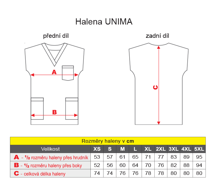 Unisexová pracovní halena Unima má pohodlný rovný střih, v přední části 3 nakládané kapsy, krátké kimono rukávy a v dolní části na bocích rozparky pro volnější pohyb. Materiál: 100% bavlna, sanfor., merc. 160g/m2. Praní: na 60°C.