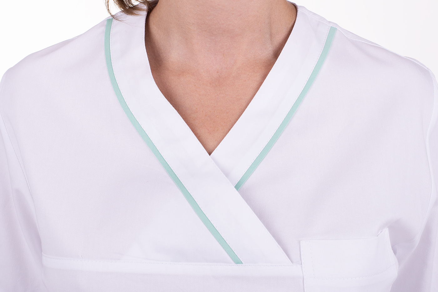 Jedinečný výstřih do V dodává halence jemně elegantní vzhled, který vás odliší od klasických „unisex“ oděvů. Navíc decentní barevné zdobení výstřihu a rukávů dodává každému modelu nádech osobitosti, aniž by narušovalo předepsaný pracovní dresscode.