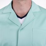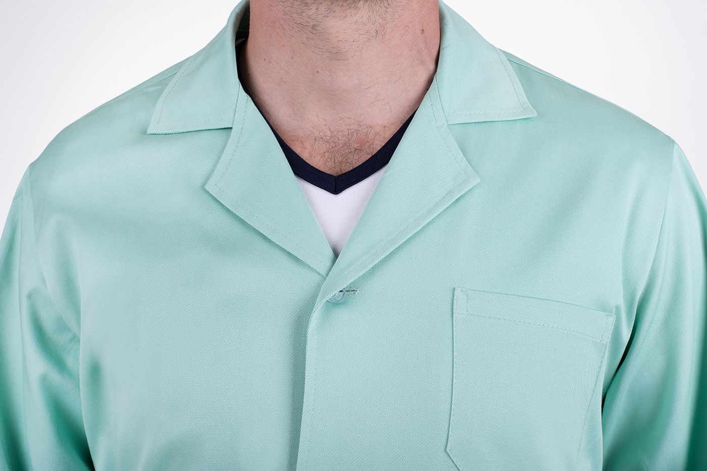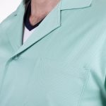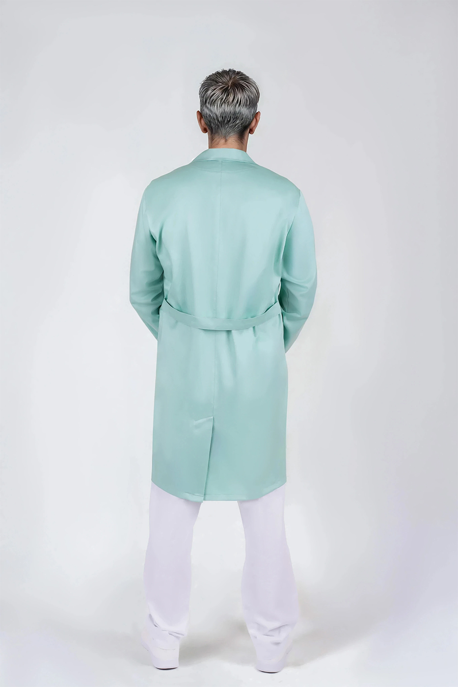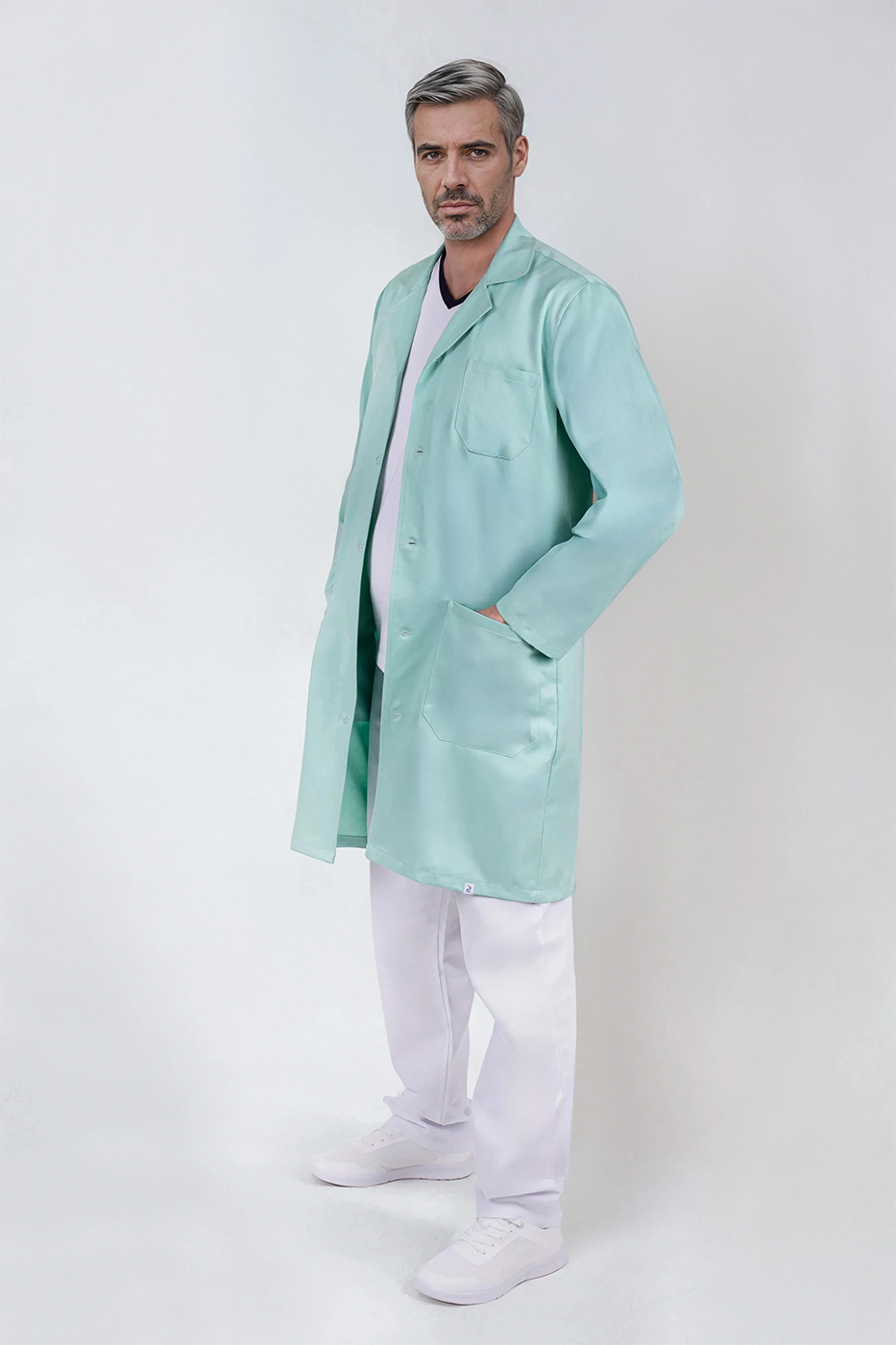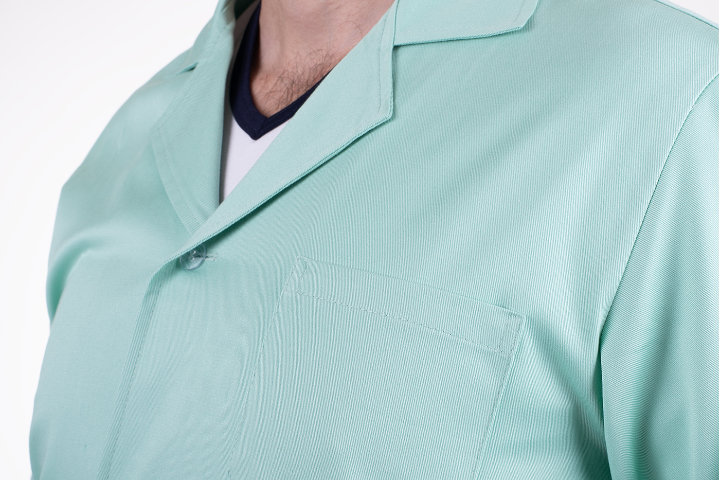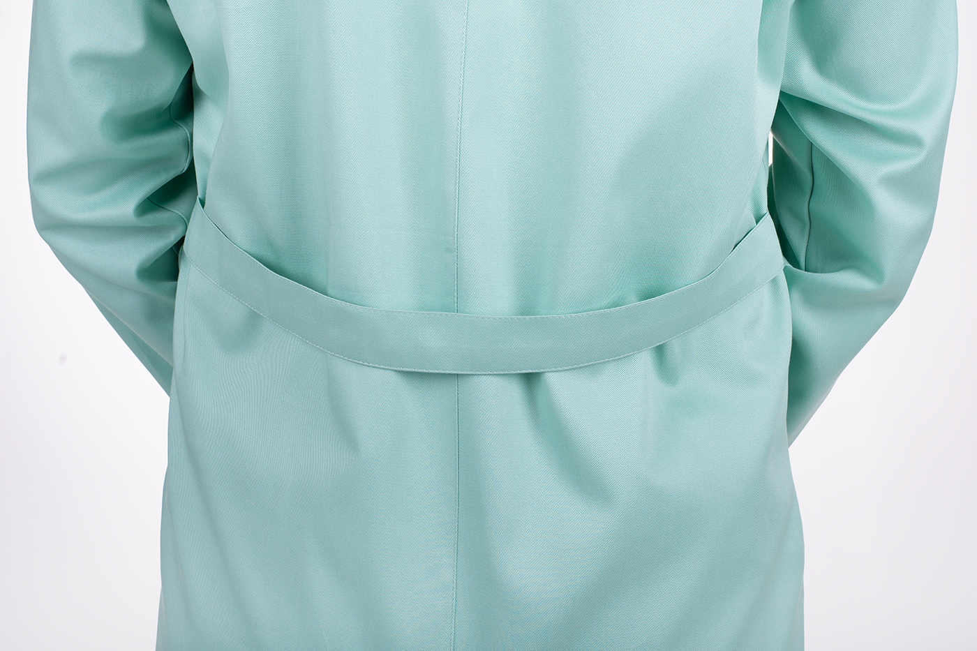 Délka pláště je dostatečně dlouhá, aby poskytla ochranu před kontaminací nebo potřísněním i při sedavé práci. Zajímavým prvkem je mentolová barva – decentní, ale přitom jiná než běžná bílá. Působí svěže, moderně a odlišuje se od standardního zdravotnického vzhledu, čímž může podpořit image celého týmu.