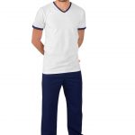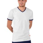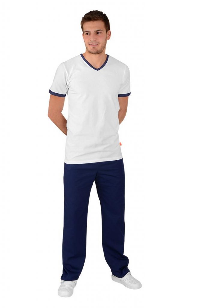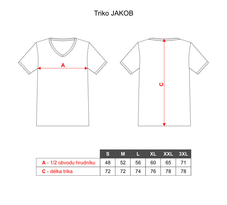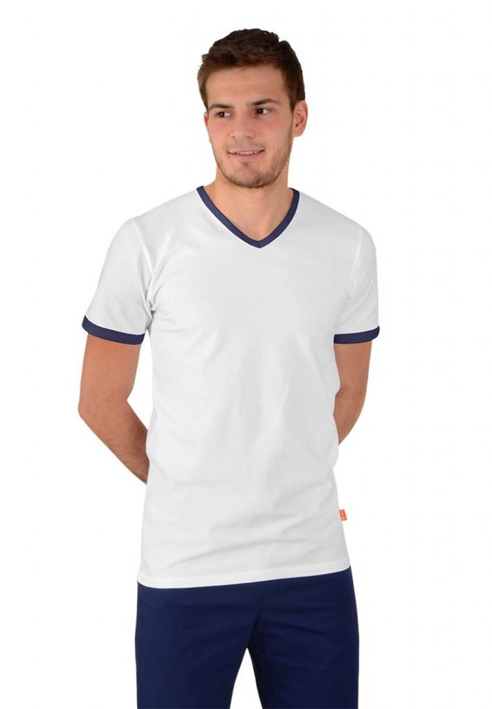Pánské tričko Jakob má výstřih do V pro pohodlné oblékání a zdobení modrým proužkem ve výstřihu a na krátkých rukávech. Triko šijeme z kvalitního materiálu s přídavkem elastanu, jedná se tedy o kvalitní český výrobek. Materiál: 92% bavlna, 8% elastan. Praní na 40°C.
