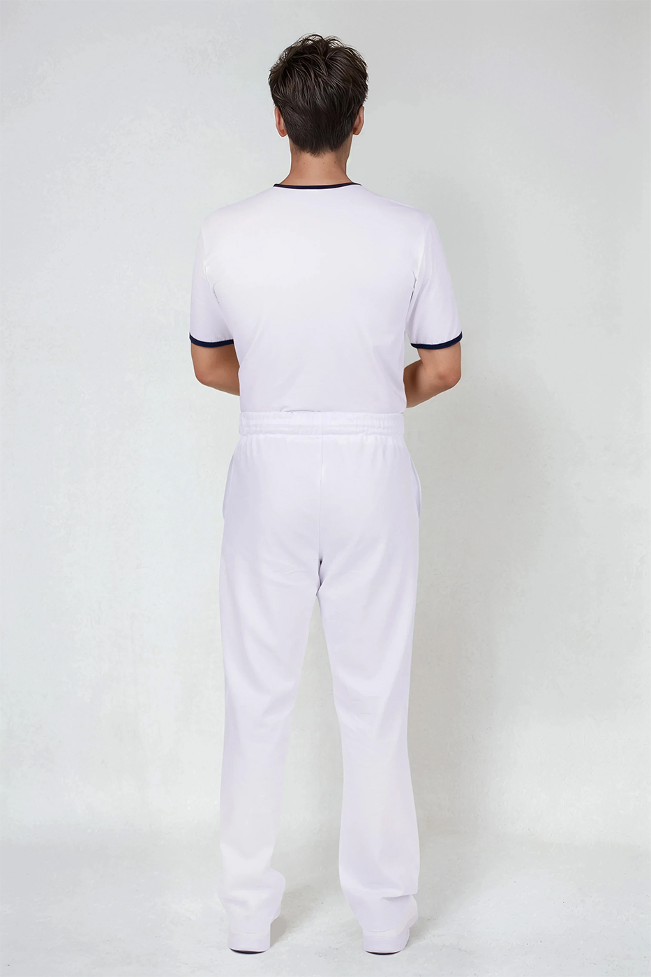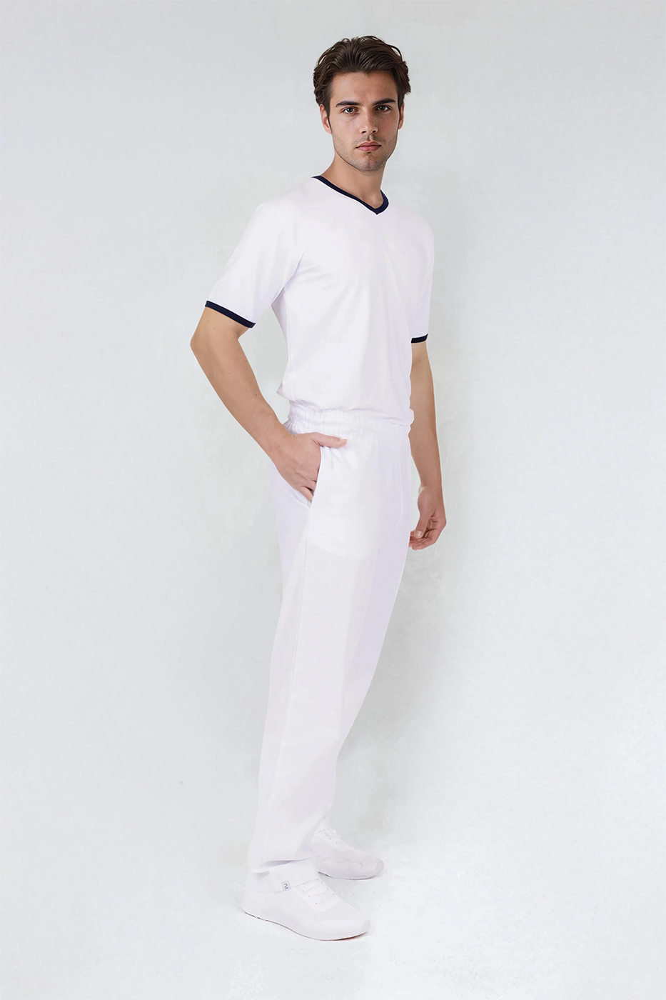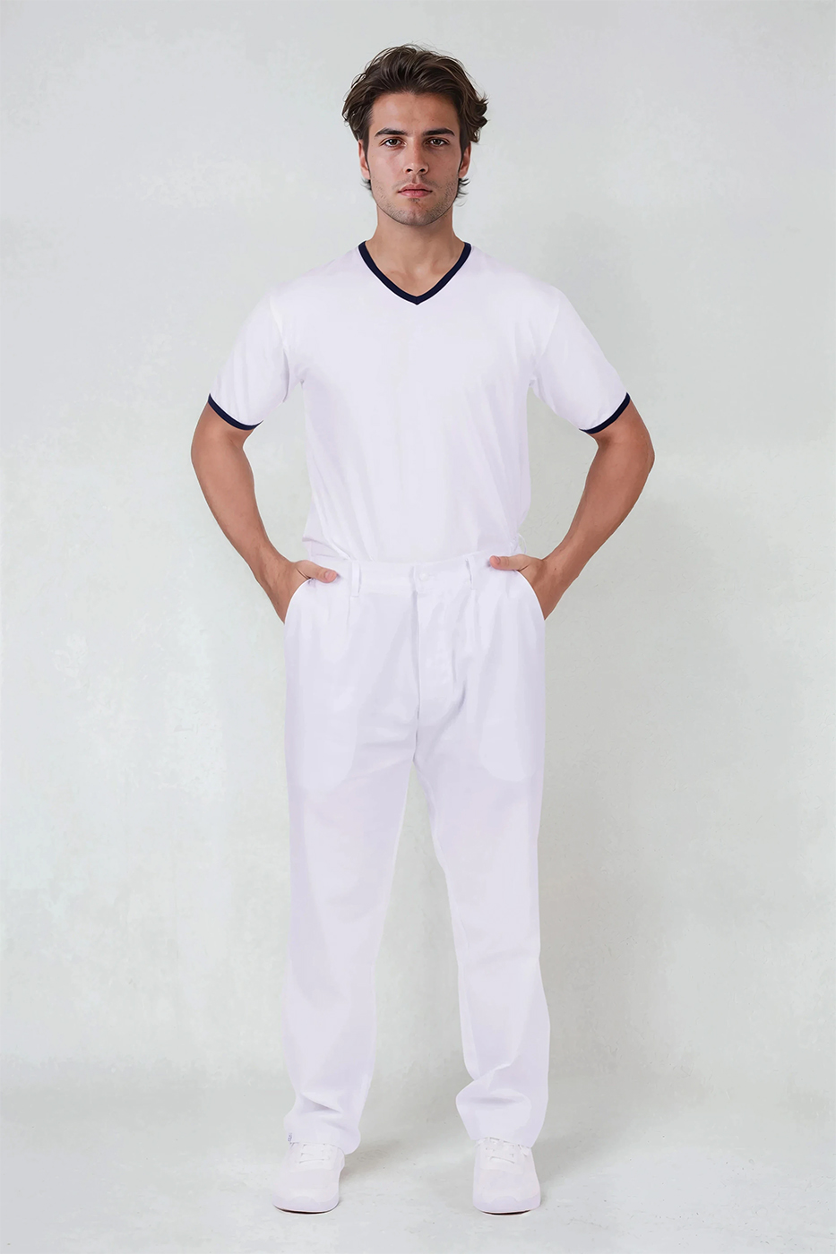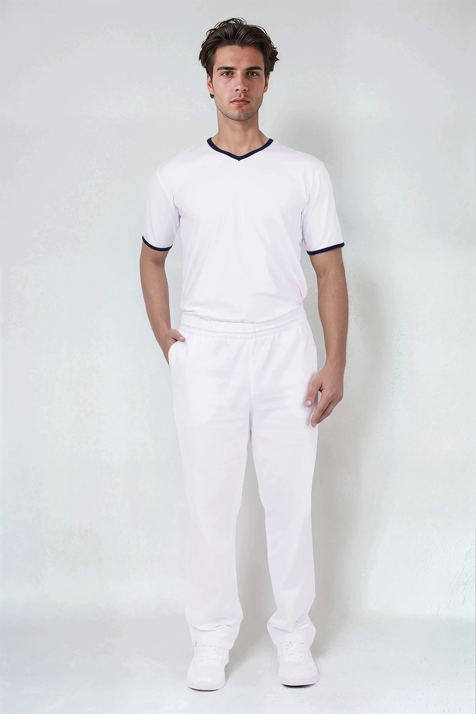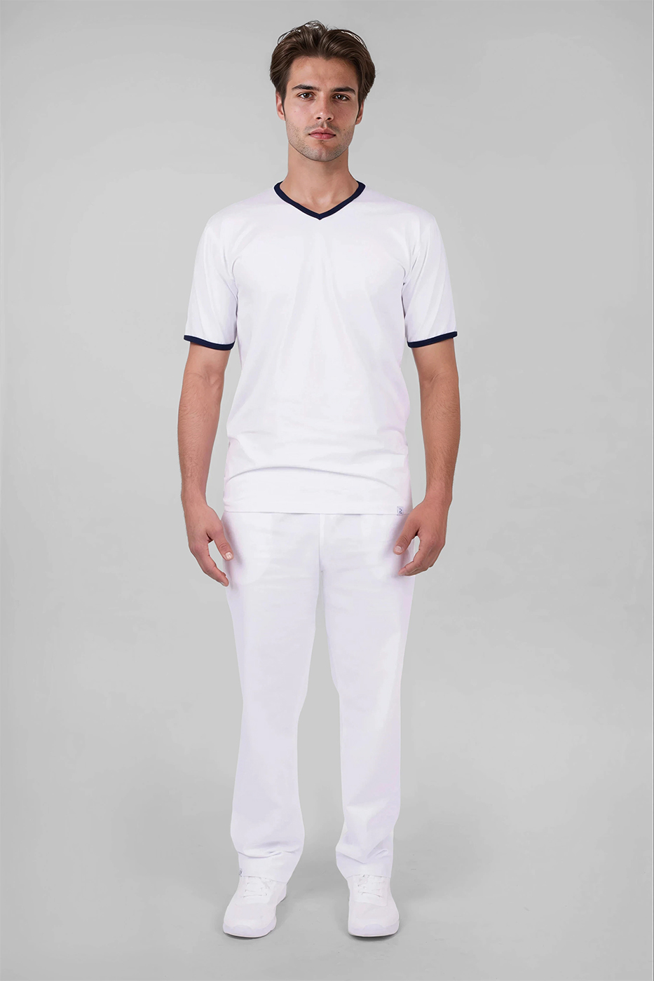 Pánské tričko Jakob má výstřih do V pro pohodlné oblékání a zdobení modrým proužkem ve výstřihu a na krátkých rukávech. Triko šijeme z kvalitního materiálu s přídavkem elastanu, jedná se tedy o kvalitní český výrobek.