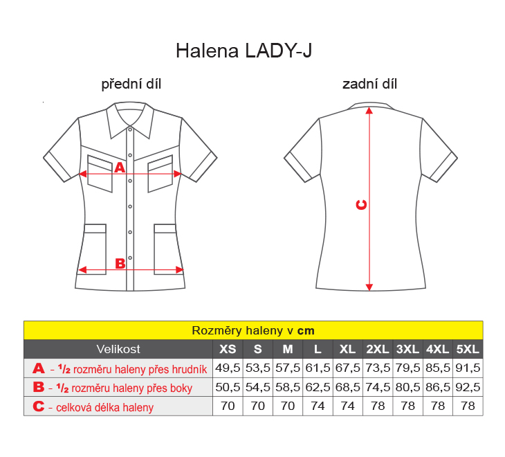 Pracovní halena Lady-J s mírně vypasovaným střihem má celopropínací zapínání na knoflíky. Průkrčník halenky je zakončený límcem a na předním díle jsou 4 nakládané kapsy. Materiál: 100% bavlna, sanfor., merc. 160g/m2. Praní: na 95°C.