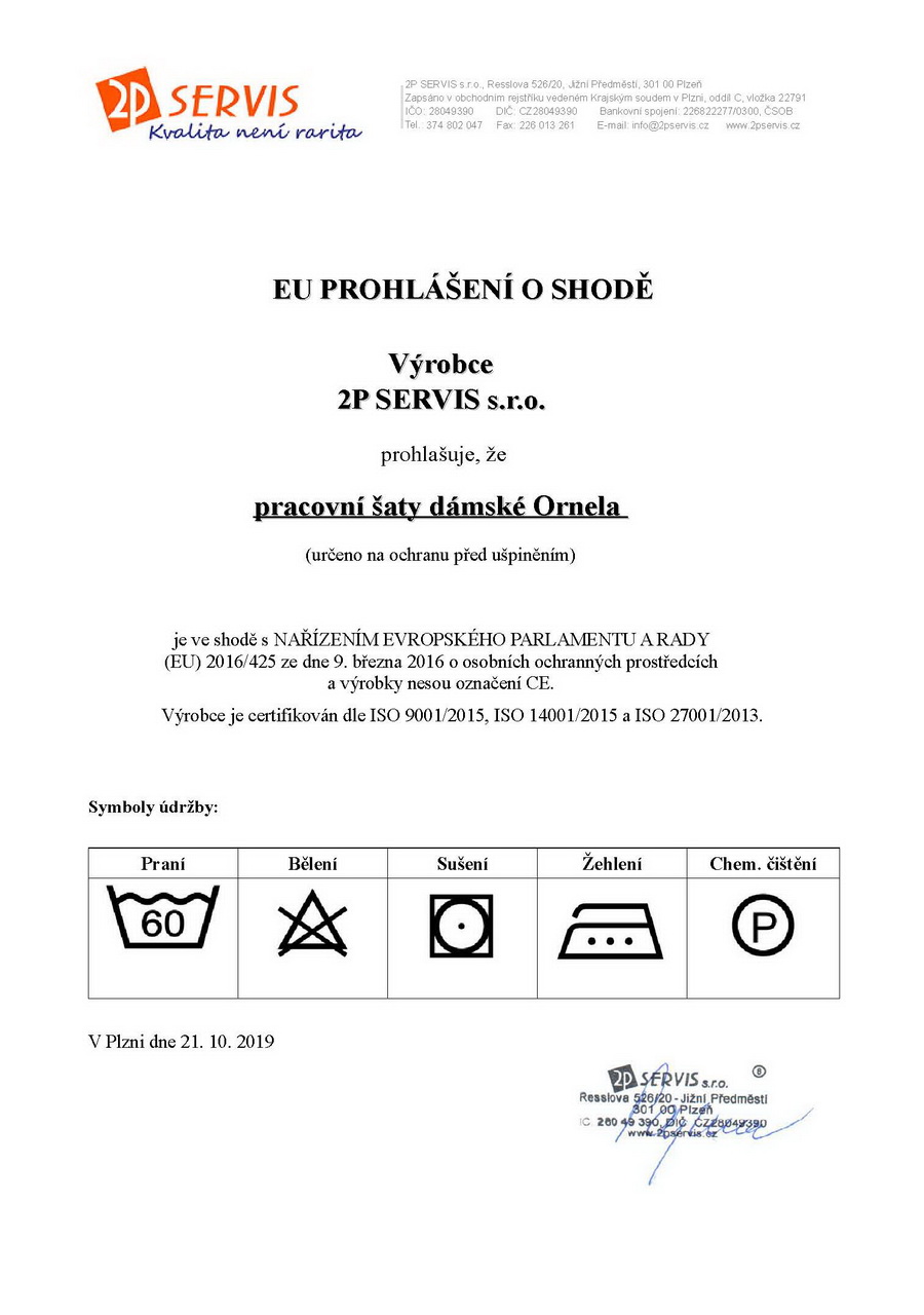 Pracovní šaty dámské Ornela Sirky mají volný áčkový střih, u kterého jsou jednotlivé díly střiženy na koso čímž je dosaženo požadované pružnosti a splývavosti. Šaty nemají záševky, na širších ramínkách je ozdobné zapínání, v bočních švech 2 kapsy a v pase úzký pásek umožňující stažení. Materiál: 100% bavlna, 125g/m2. Praní: na 60°C.
