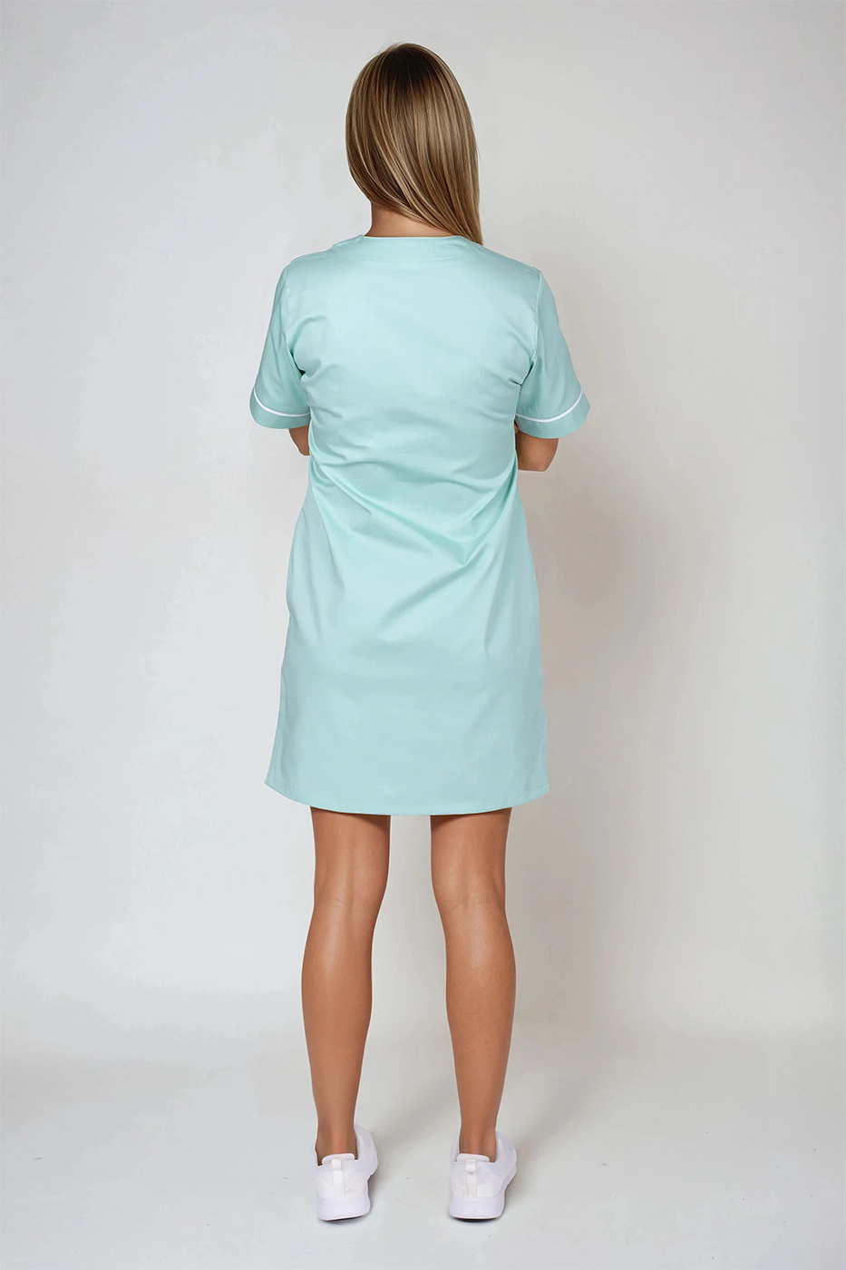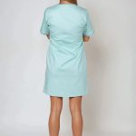 Pracovní šaty pro zdravotní sestry Julia-B mentol/bílá s mírně vypasovaným střihem a oblékáním přes hlavu, na předním díle 3 nakládané kapsy a sedlové členění, barevné zdobení na krátkých rukávech a výstřihu, zadní díl hladký, dolní kraj je rovný s krátkými bočními rozparky.