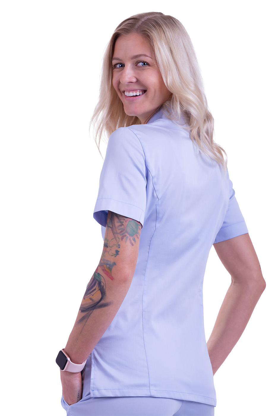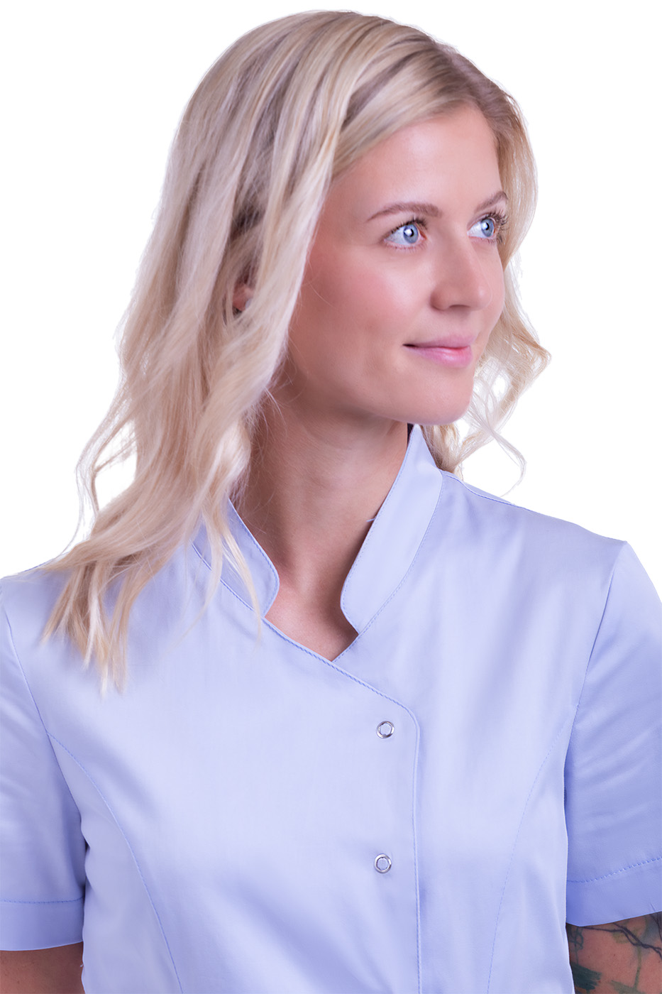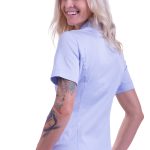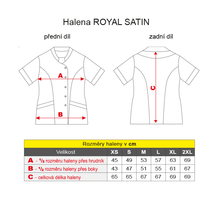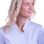 Pracovní tunika dámská Royal Satin světle modrá s celopropínacím zapínáním na 5 druků, 2 prostorné kapsy, stojáčkový límec, kimonový střih. Materiál: 97% bavlna, 3% elastan, bavlněný satén 125g/m2. Praní: na 40°C.