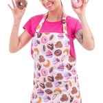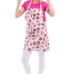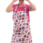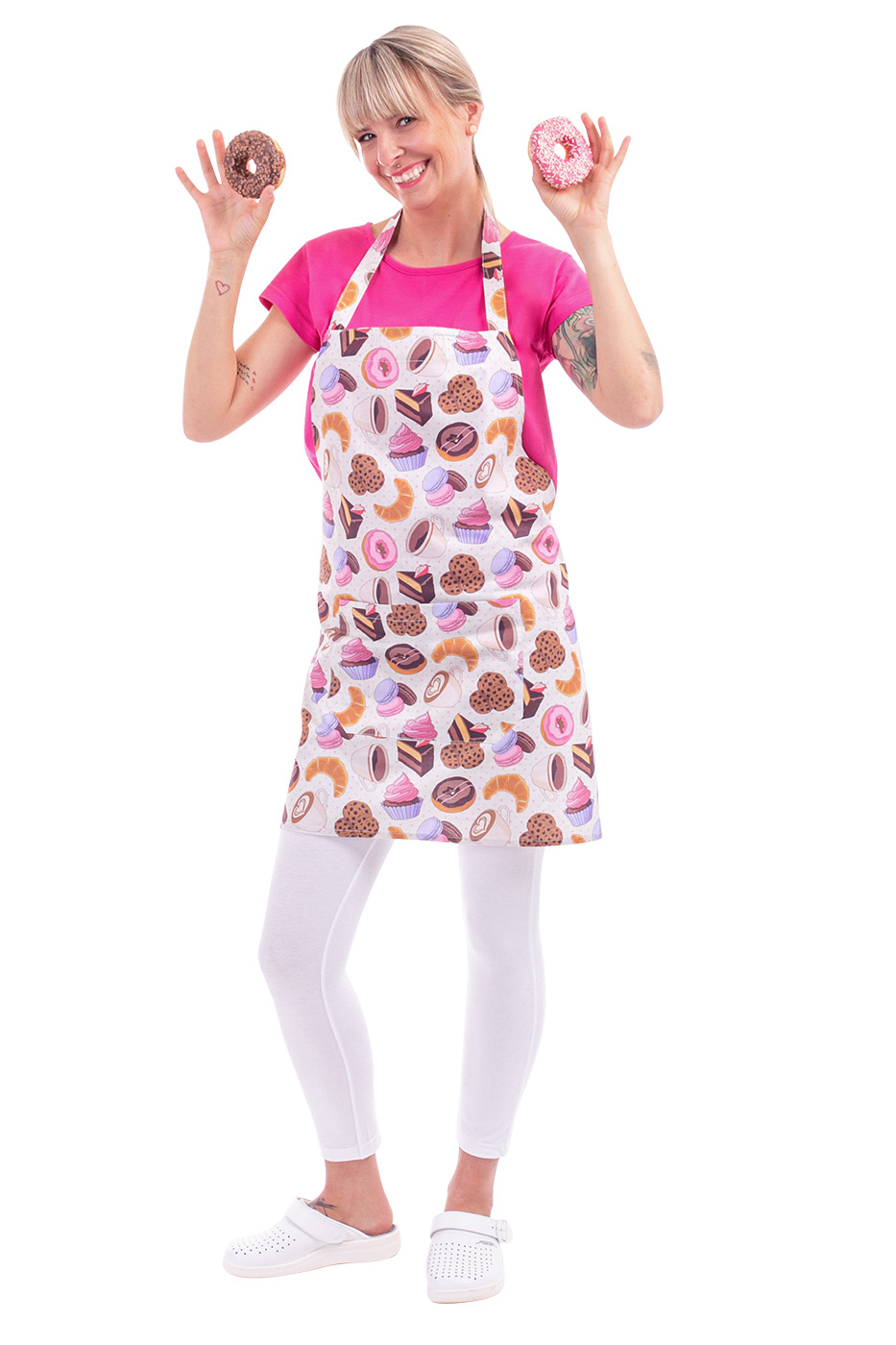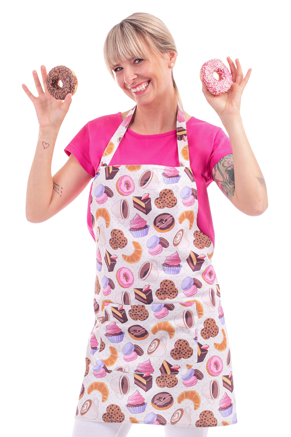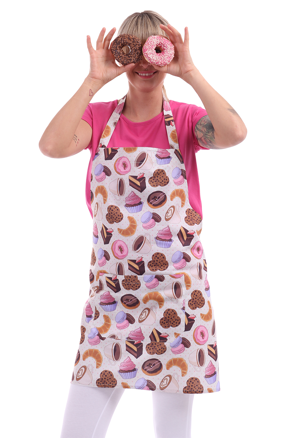 Stylová zástěra se vzorem muffinů s laclem a praktickým zavazováním vzadu. Materiál: 100% bavlna, 150g/m2. Rozměry: 65cm šířka, 68cm délka (výška). Praní: na 40°C.