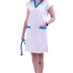 Šaty pro zdravotní sestry Prima Basic bílá/tyrkys jsou rovného, pohodlného střihu a výstřihem do V. Šaty mají 3 prostorné kapsy a pro snadnější pohyb jsou opatřeny v dolní části rozparky. Materiál: 100% bavlna kepr 160g/m2. Praní: na 60°C.
