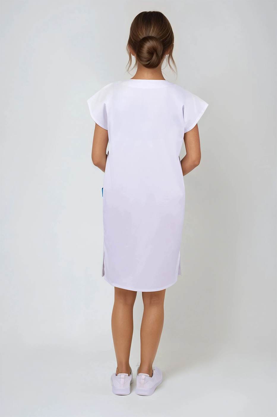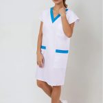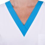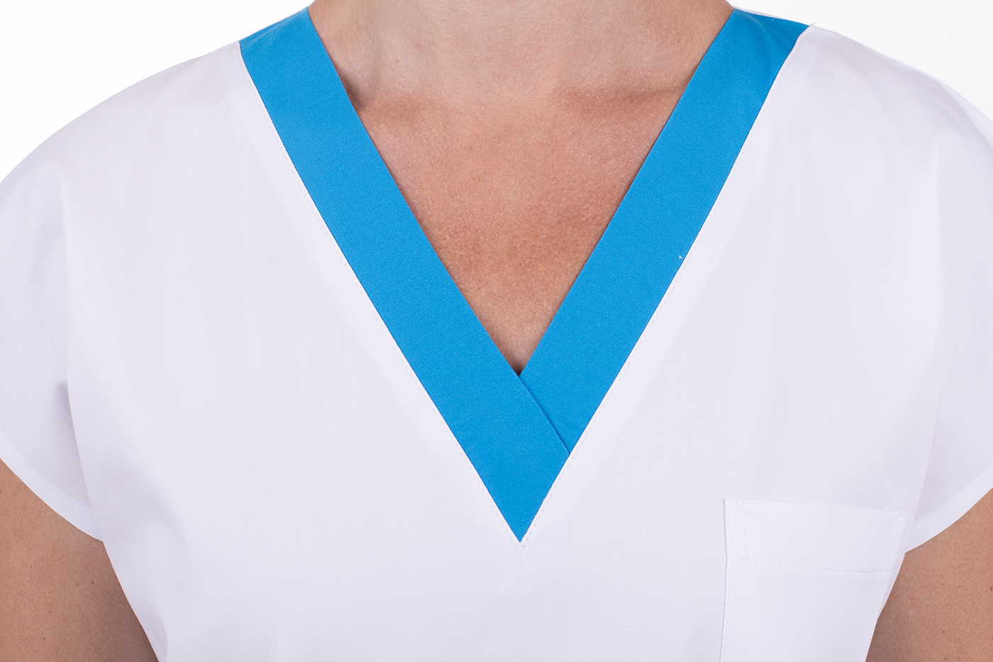 Díky výstřihu do V a krátkým rukávům se šaty příjemně nosí i během teplejších dnů nebo při práci v přetopených prostorách. Kombinace barev – čistě bílé s tyrkysovým lemováním – vytváří svěží a profesionální dojem, který ocení nejen samotné nositelky, ale i jejich pacienti. Tyrkysová je navíc vnímána jako barva klidu, empatie a důvěry – ideální volba pro prostředí, kde hrají emoce významnou roli.