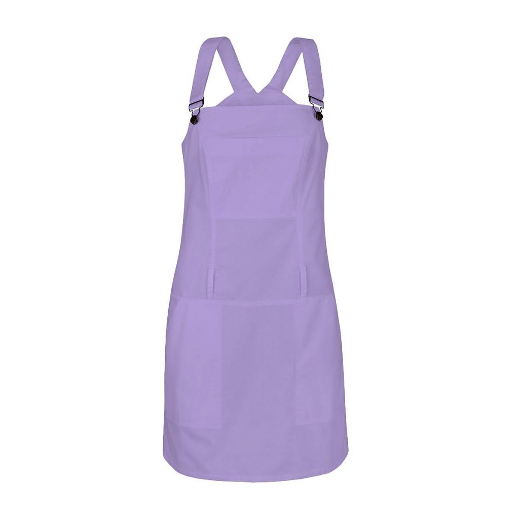 Dámské šaty s laclem Toffi fialové sportovního vzhledu s ozdobným dvojitým štepováním a 5 kapsami, sukně je mírně rozšířená se zapínáním na zdrhovadlo v bočním švu. Součástí dodávky není pásek. Materiál: 50% bavlna, 50% PES, sanfor. 170g/m2. Praní: na 60°C.