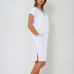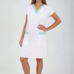 Střih je mírně projmutý, aby lichotil ženské postavě, ale zároveň zachovává dostatek prostoru pro volný pohyb při práci. Krátké rukávy zajišťují pohodlí i v teplejším prostředí a šaty tak ideálně padnou ženám všech věkových kategorií i postav.