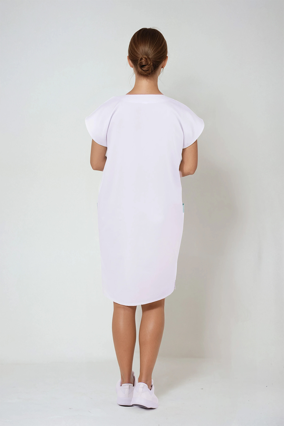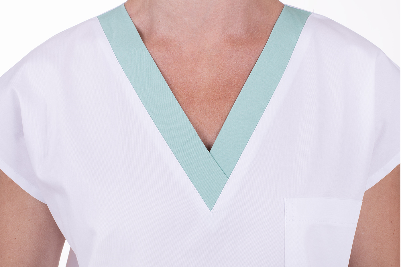 Model v bílé barvě s jemnými světle modrými akcenty působí nejen čistě a profesionálně, ale také svěže. Tato barevná kombinace je v pracovním prostředí velmi oblíbená, protože symbolizuje hygienu, klid a důvěru – vlastnosti, které si sesterství přirozeně spojujeme.