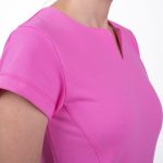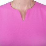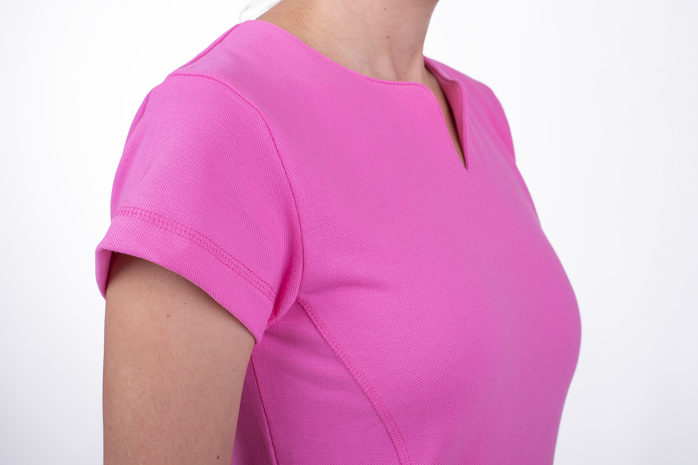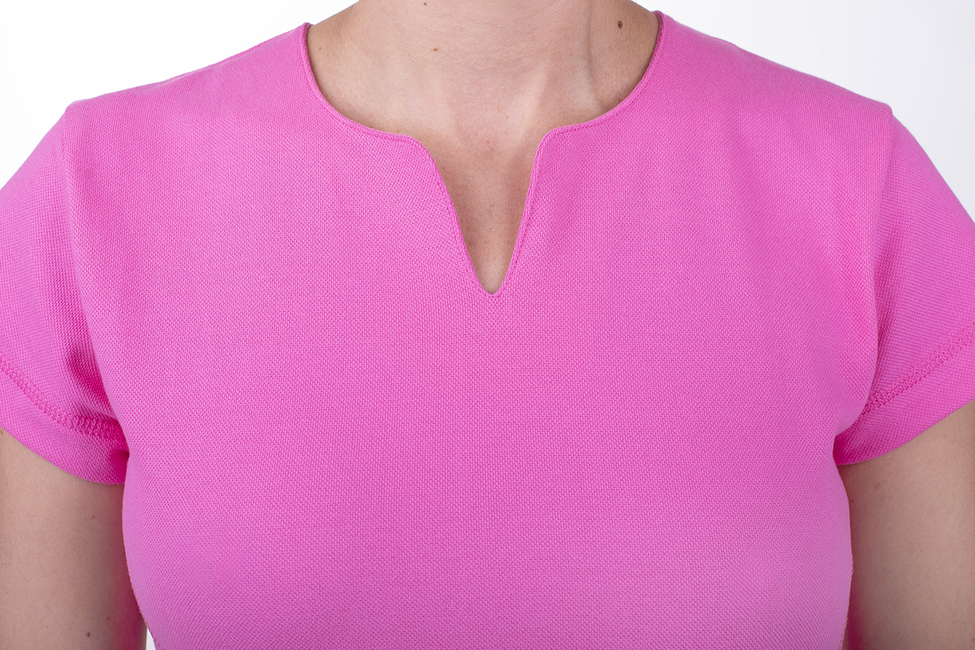 Kulatý výstřih s jemným véčkovým rozparkem uprostřed působí elegantně a decentně. Zvýrazňuje krk, ale zachovává profesionální vzhled, což je ideální kombinace pro zdravotnické prostředí. Krátké rukávy klasického střihu zajišťují volnost pohybu a příjemné klima i v teplejších místnostech.