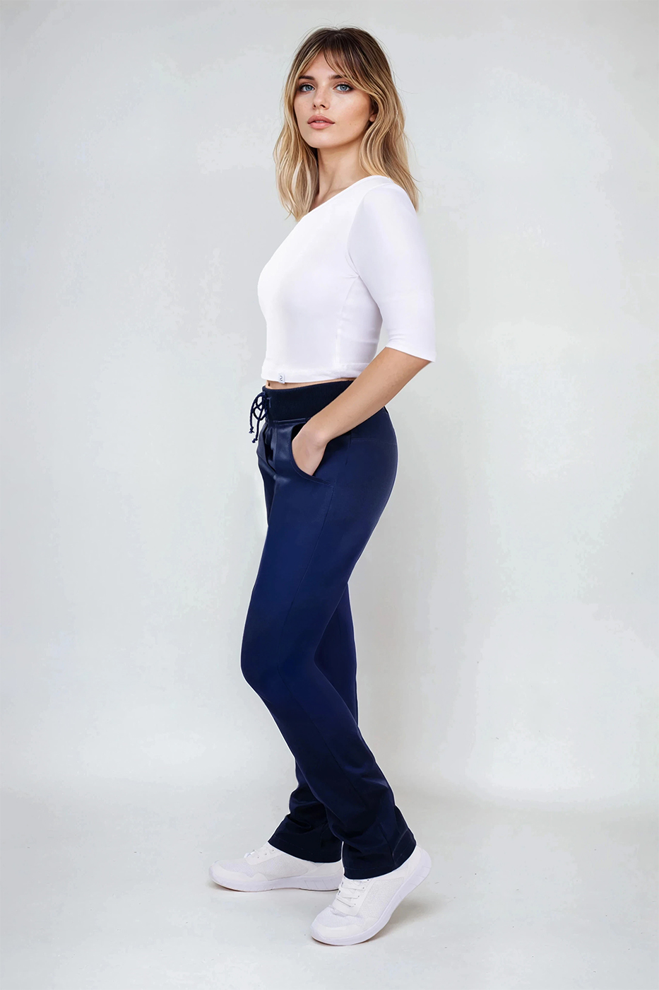 Pas kalhot je pružný a vyrobený ze 100% bavlněného žebrového úpletu, což zajišťuje pohodlí a flexibilitu. Navíc je doplněn stahovací šňůrkou, která umožňuje úpravu pasu podle potřeby. Strečové kalhoty dámské mají tři praktické kapsy, ideální pro uložení drobností.