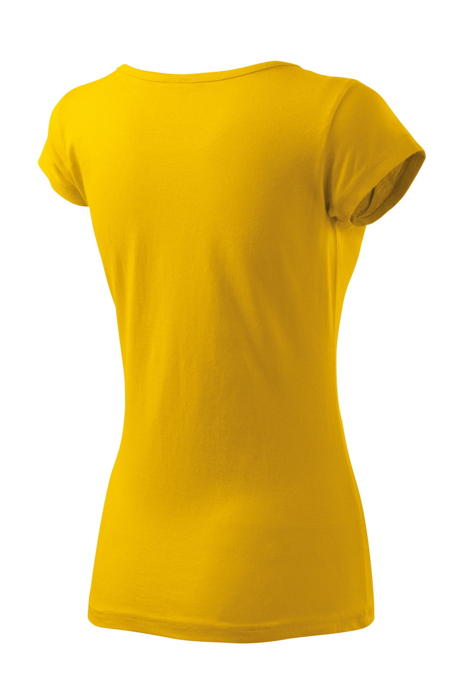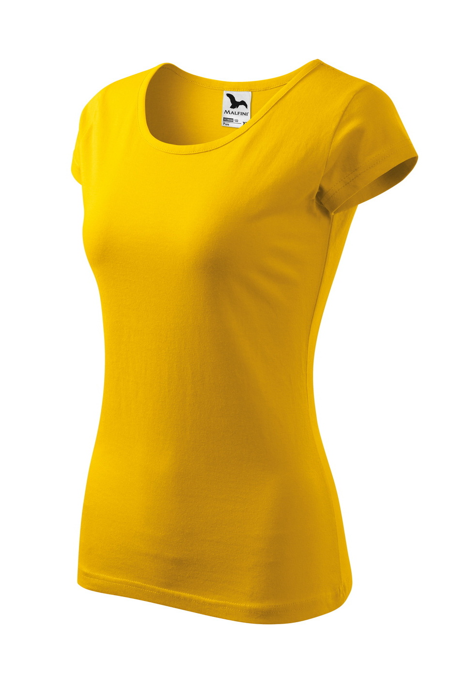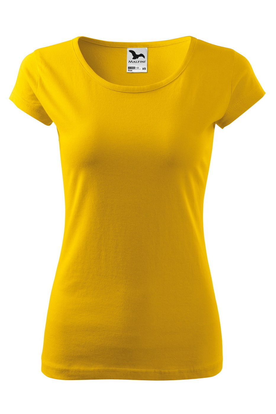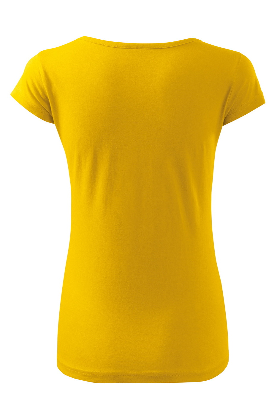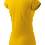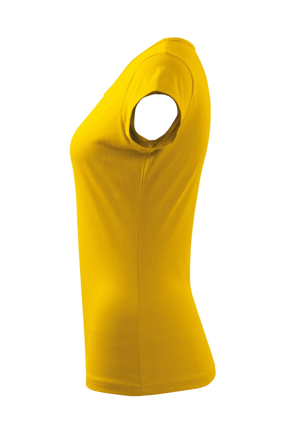 Moderní dámské tričko žluté barvy s velmi krátkým rukávem, kulatým průkrčníkem s olemováním, ramena zpevněná všitým proužkem, projmutým střihem k bokům zvýrazňujícím dámskou siluetu, exkluzivním vzhledem dík finální silikonové úpravě. Materiál: 100% bavlna, 150g/m2. Praní: na 40°C.