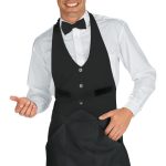 Pracovní zástěra Garcon černá je vhodná pro obsluhující ve vinárnách, hospodách či vinotékách. Uni velikost. Krátká zástěra se 2 kapsami a falešná vesta s knoflíky. Zapínání za krkem pro regulaci. Materiál: 100% polyester 220g/m2.