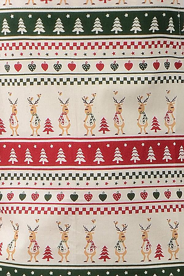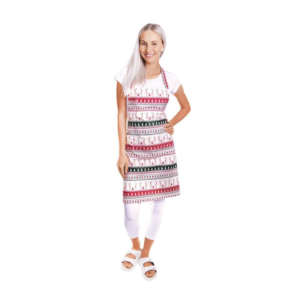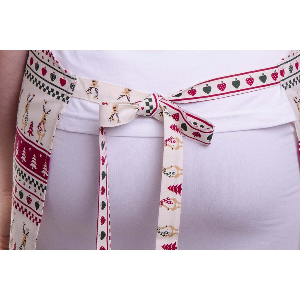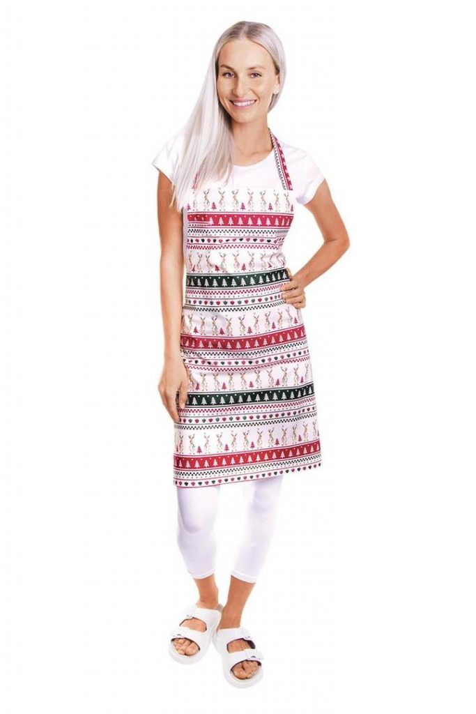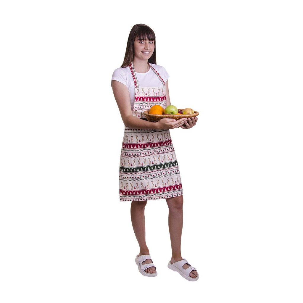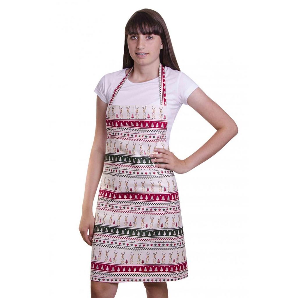 Stylová zástěra se vzorem vánočních sobů s laclem a praktickým zavazováním vzadu. Materiál: 100% bavlna, 150g/m2Rozměry: 65cm šířka, 68cm délka (výška). Praní na 40°C.