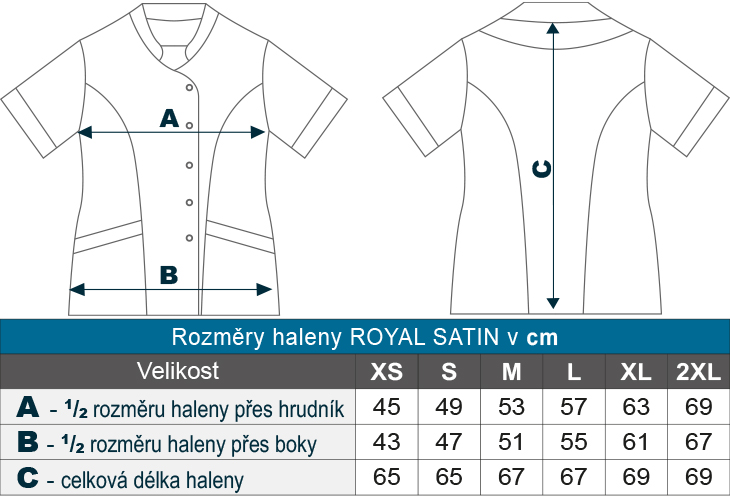 Zdravotní halena je k dispozici v různých velikostech a díky univerzálnímu střihu perfektně padne různým typům postav. Značka Royal Satin navíc nabízí možnost výběru z dalších barevných variant, což umožňuje sladění s firemními barvami nebo osobním vkusem.